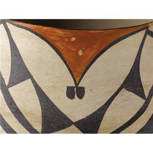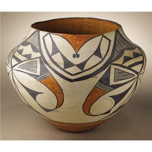 <B>Acoma Polychrome Pottery Jar</B></I><BR>Circa 1930<BR>Height 9 1/4 in. Diameter 12 in.<BR><BR>The three-color olla is characterized by a concave base, flaring sides, high shoulder, and tapering neck. The jar is painted in a single wide band around the body using various stylized bird and feather elements, both solid and hatched, in red and black against the cream slip.<BR><BR>Provenance<BR>Bonhams and Butterfields, Sale 7477E, Lot 3366, December 8, 2003.<BR><BR> <BR><BR><B>Important notice: