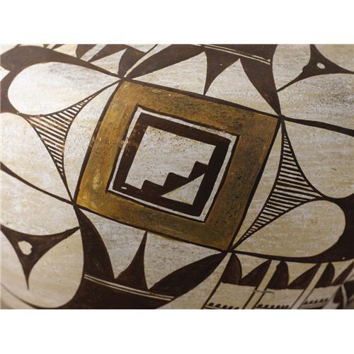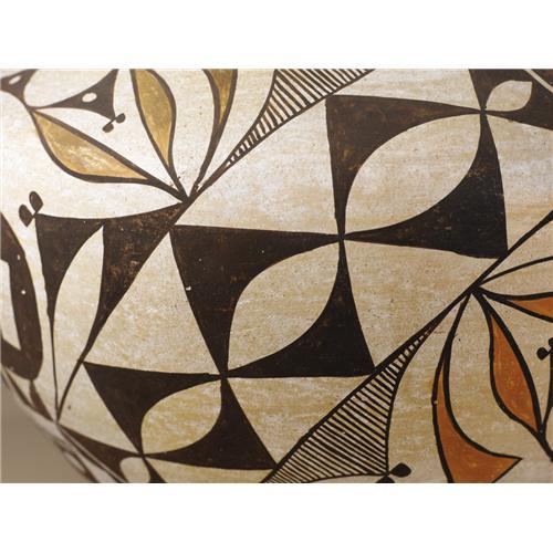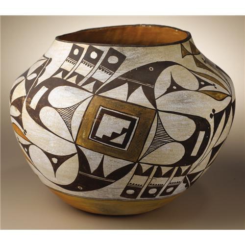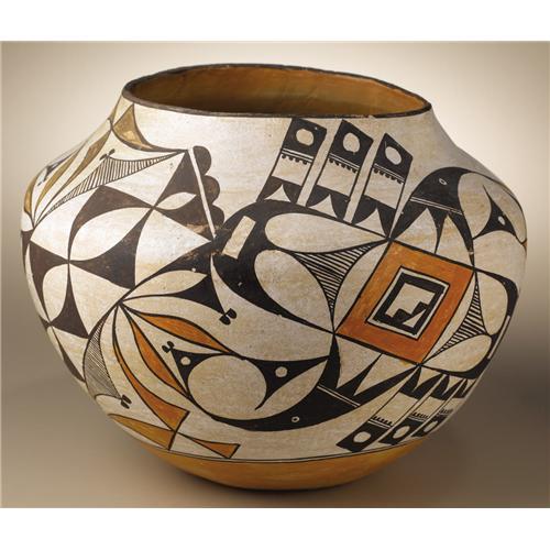 <B>Acoma Polychrome Pottery Jar</B></I><BR>Circa 1930<BR>Height 9 1/4 in. Diameter 11 3/4 in.<BR><BR>This typical three-color olla has a concave base, flaring sides, high shoulder, and tapering neck. Two pairs of mirrored thunderbirds are painted in a single band around the jar with solid and hatched elements in black and orange against the cream slip. The thunderbirds are separated by diagonal bands containing negative lozenge forms. The jar has an orange underbody.<BR><BR>Provenance<BR>Bonhams and Butterfields, Sale 7477E, Lot 3366, December 8, 2003.<BR><BR> <BR><BR><B>Important notice: