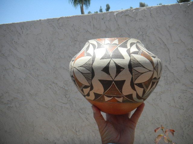 Acoma Pot Head pot with concave bottom from 1930 approximately 8 by10 inches. It has a crack and three pieces have been broken glued back. Shipping $18.00