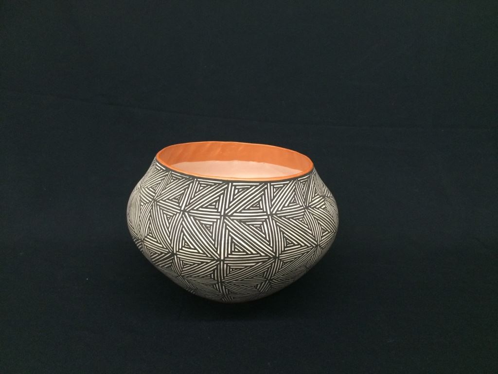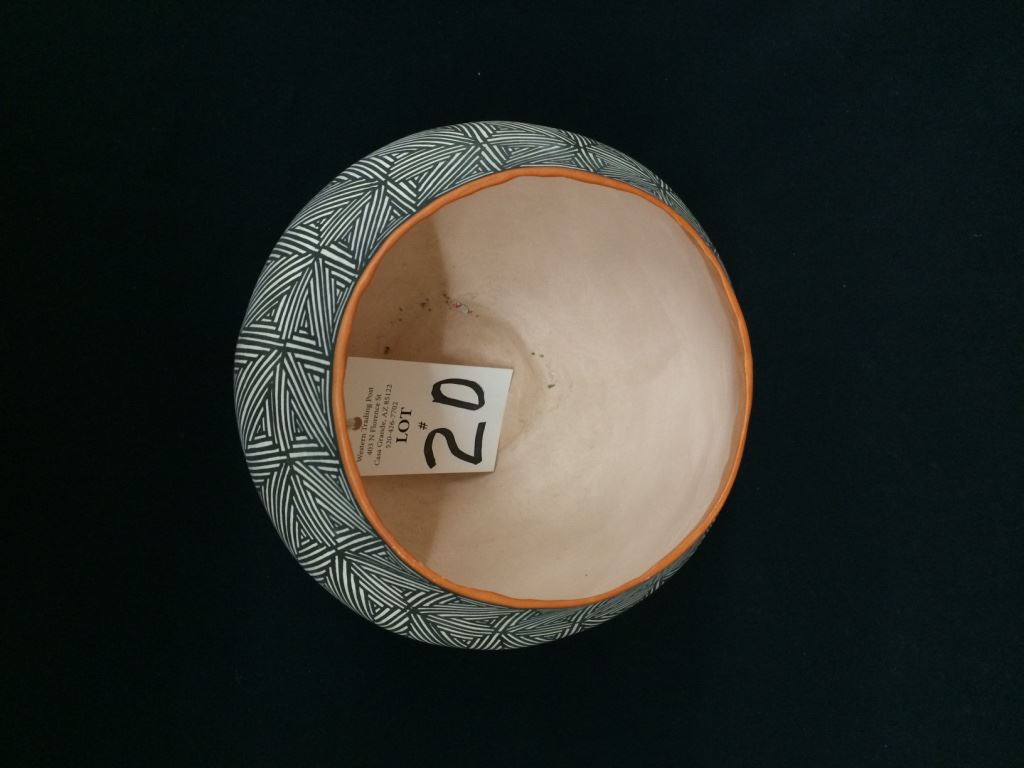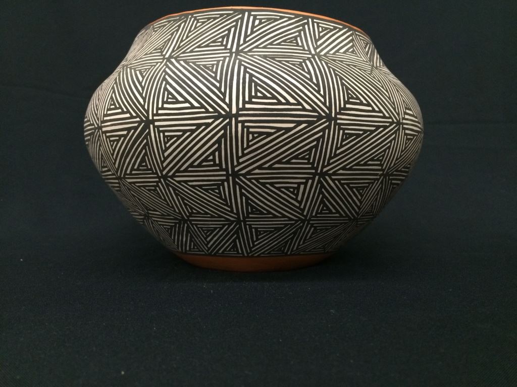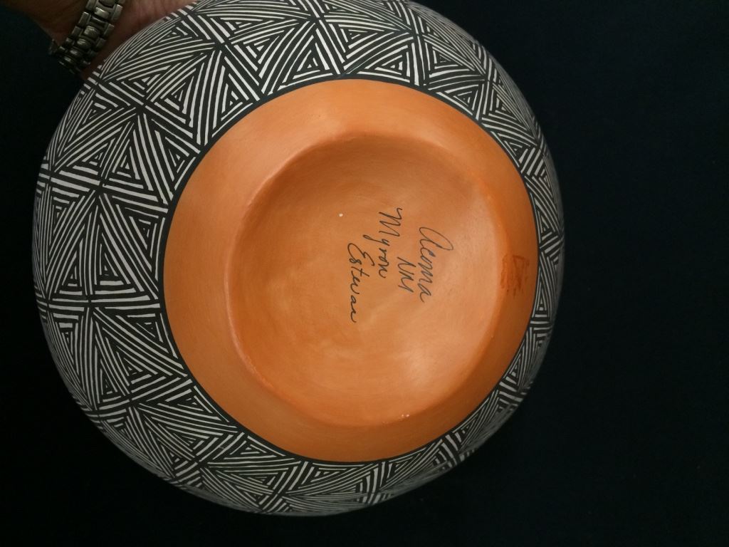 This nicely painted Acoma pot by Myron Estwar measures 6” tall by 9” wide. In very nice condition.