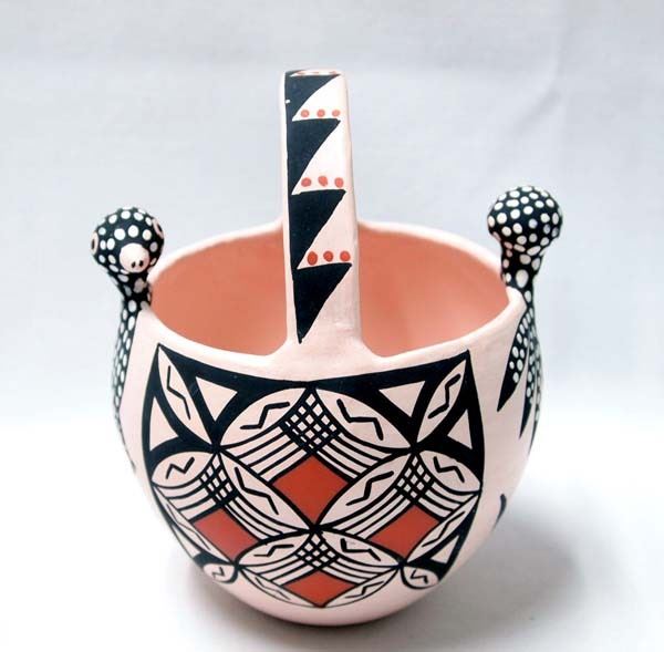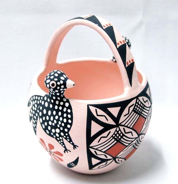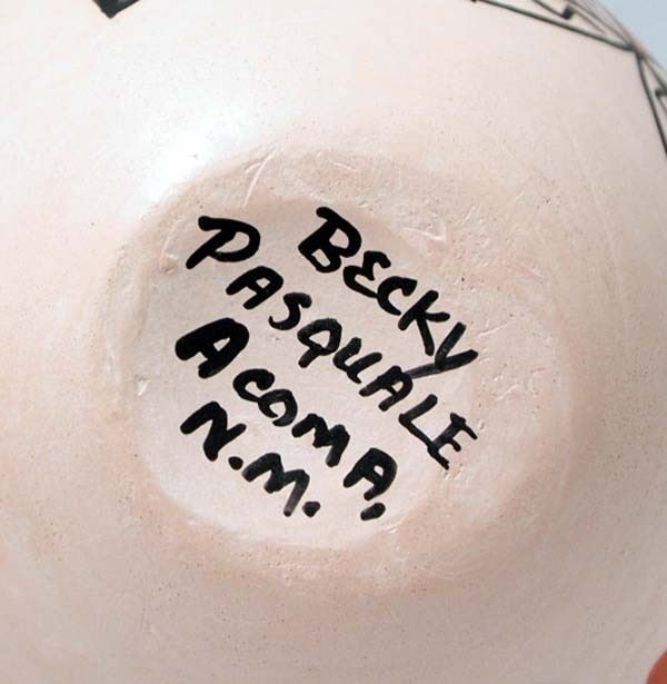 Native American Acoma Polychrome Pottery Bird Basket by Rebecca ''Becky'' Pasquale (1941-2006), measures 5''H x 4.25''W x 4''Deep and is signed by the artist, Sweet! FYI: ''Born in the 1941, Rebecca Pasquale began pottery in the 1960's to the present. She is known for traditional black and white fine design polychrome jars, bowls and seed pots. Rebecca is listed in the Southern Pueblo Pottery 2000 Artist Biographys by Gregory Schaaf.''