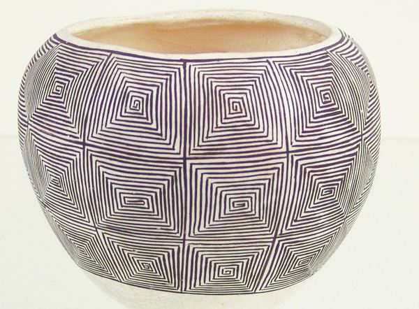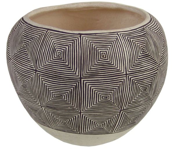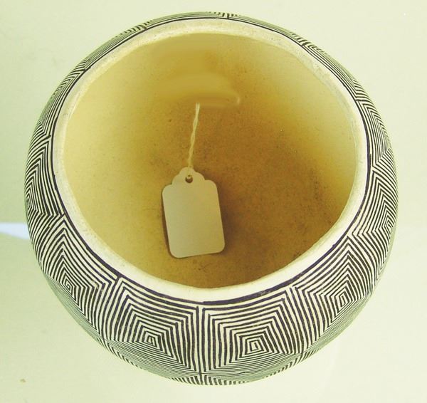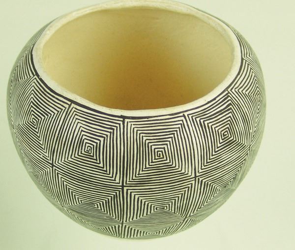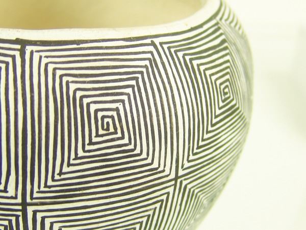 Wonderful, black-on-white deep bowl the exterior completely covered with eye dazzling, fine line scrolled boxes, an optical masterpiece! Very good condition.Ca. 1980s5" x 6"