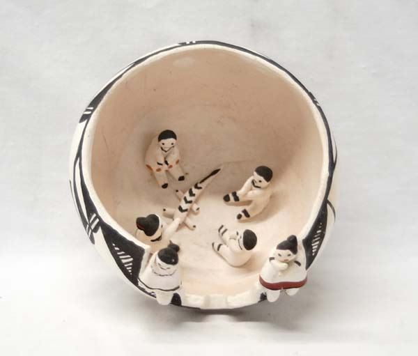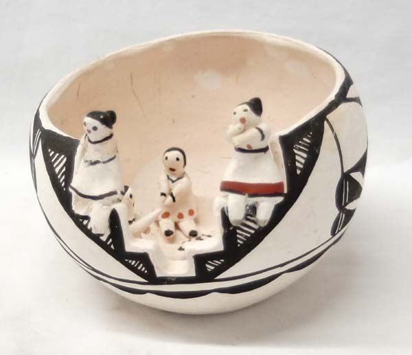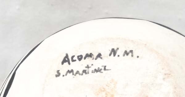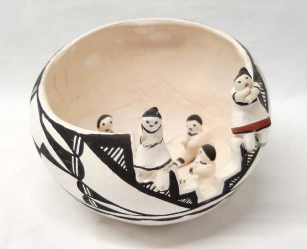 Native American Acoma Pottery Friendship Jar by S. Martinez, measures 4''H x 5''D, signed by artist, one of the pottery figures on rim has major damage (missing both arms and 1 leg, the other pottery figure on the rim has been glued