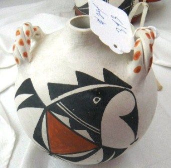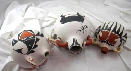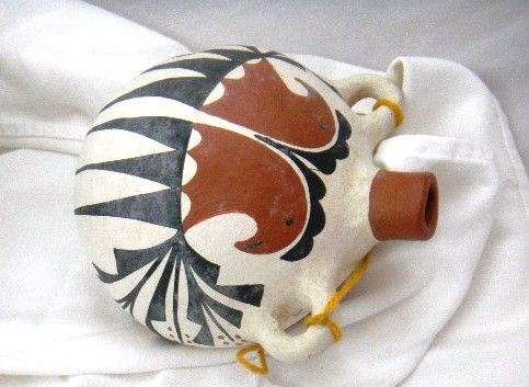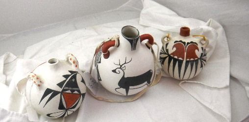 Acoma Pottery Canteens. Two with Bird motifs. One with elk motif. One is signed. Items are from 1960's. Shipping $18.00