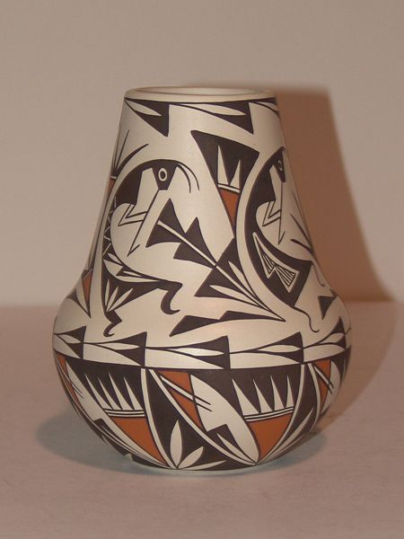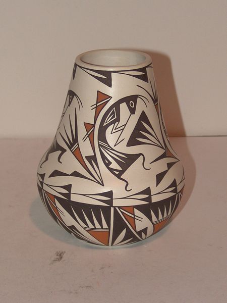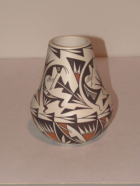 Late 1900s, Contemporary design polychrome-on-buff vase with Kokopellis and other more traditional forms. Very good condition. 5-3/4" x 4-3/4"