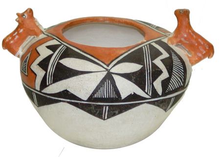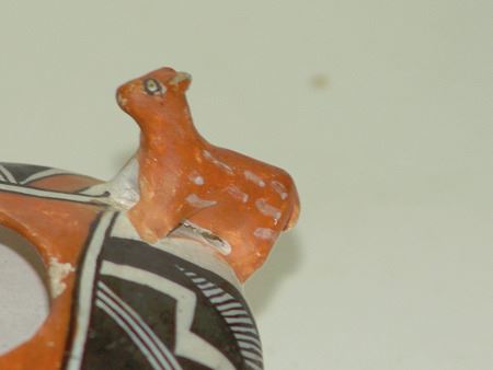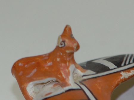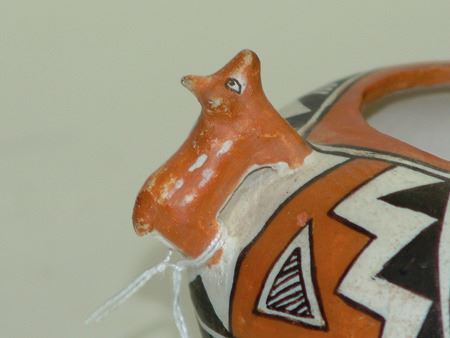 Ca. 1980s, Unique polychrome jar with fawn/cow/dog(?) figures attached. Good condition, missing one ear and has some small chips and dings. 4-1/4" x 6-3/4" x 5"
