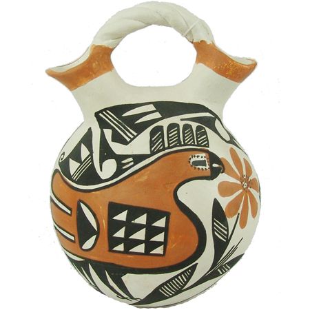 Ca. 1970s, Classic polychrome double-necked vase with twist handle and parrot figures. Signed by famous potter Eva Histia, who is the daughter of Helice Vallo. Very good condition, minor surface scratches. 10" x 7-1/2"