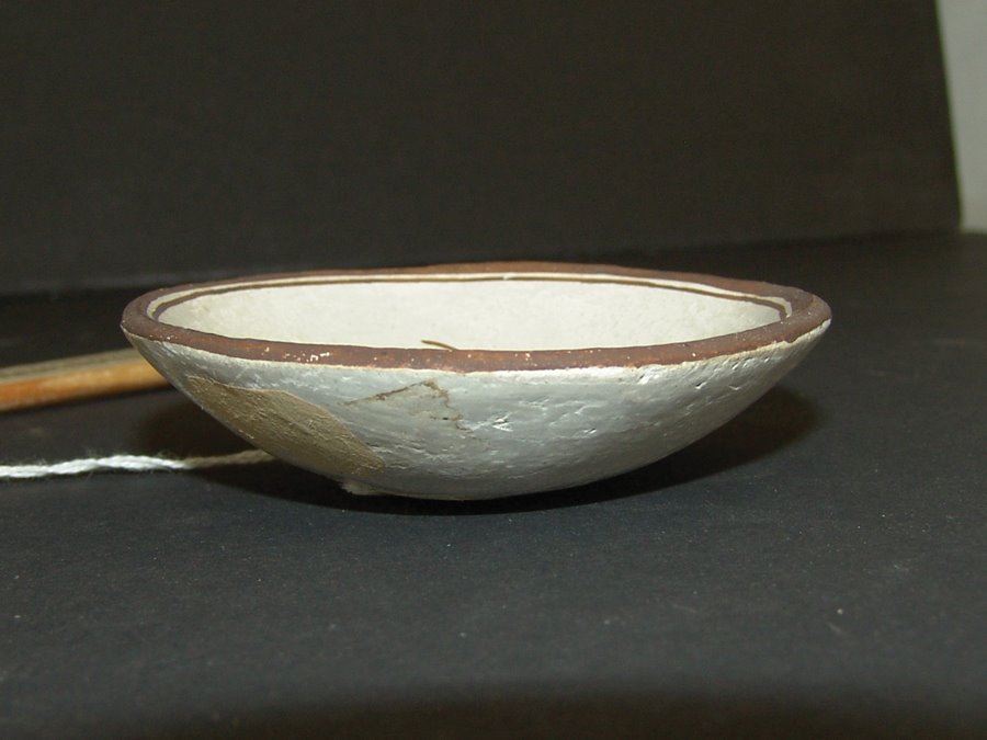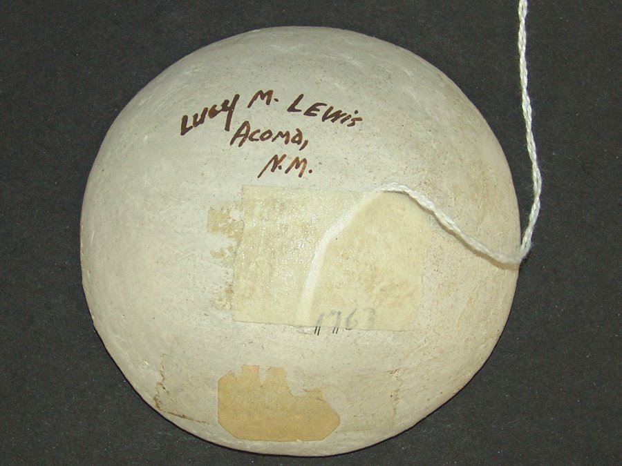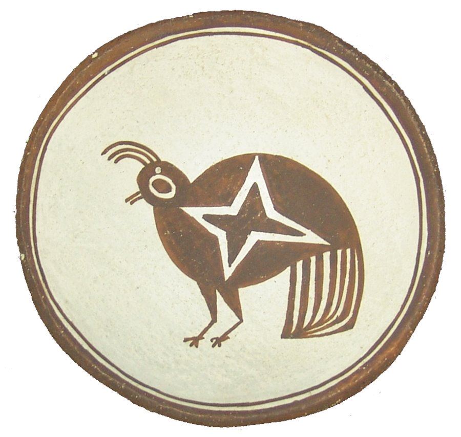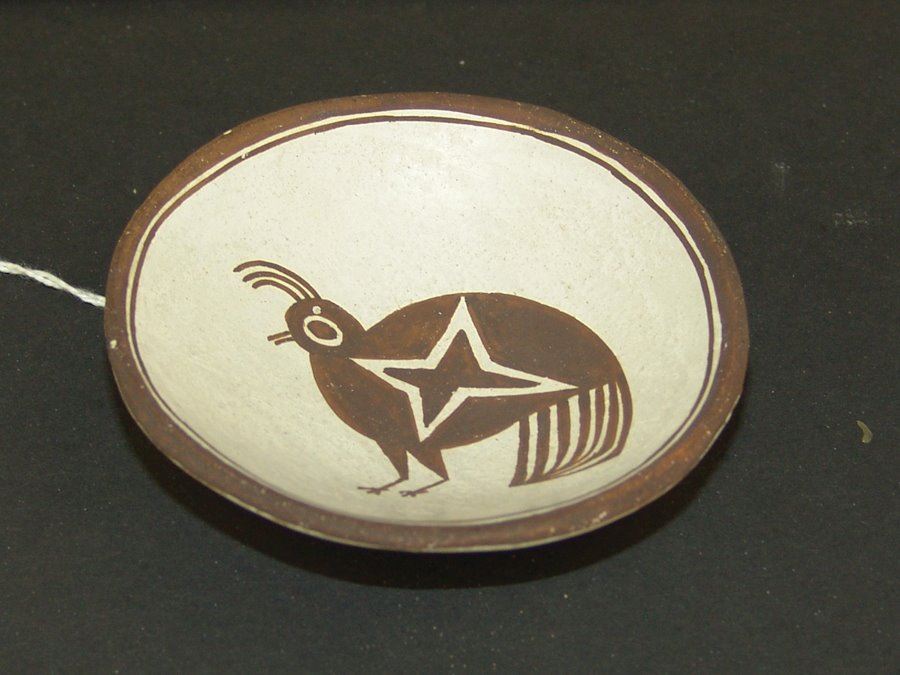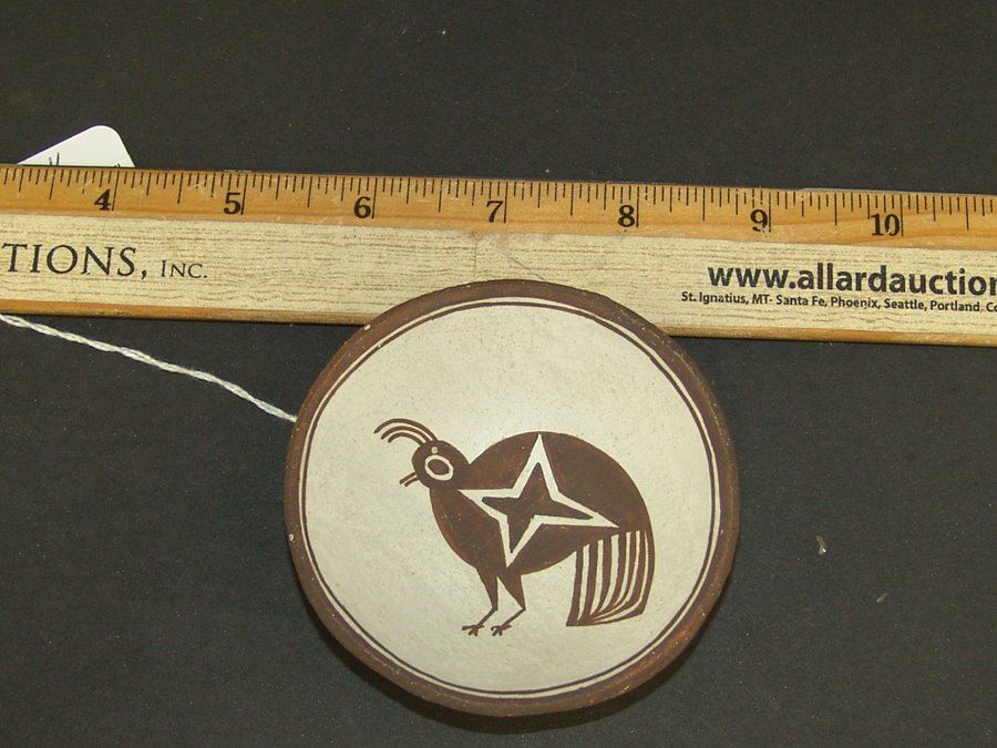 Small black-on-white dish with quaic(?) figure in the middle done by Acoma's most famous potter, Lucy Lewis. Very good condition.,,3/4" x 3-1/8"
