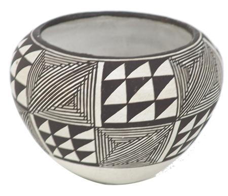 Circa 1970s, Traditional black-on-white fineline jar by the Acoma master potter, Lucy Lewis. Very good condition, shows light handling. 3-1/4" x 4-1/2"