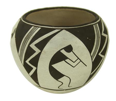 Circa 1980s, Very fine black-on-white pottery jar with Lucy's famous flute playing ant figures. Very good condition. 3-1/2" x 4-1/4"