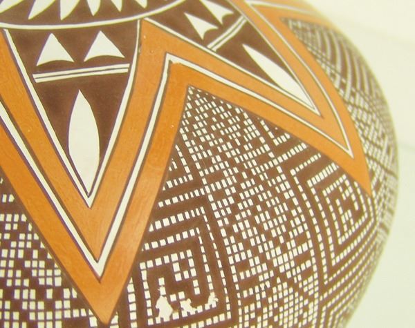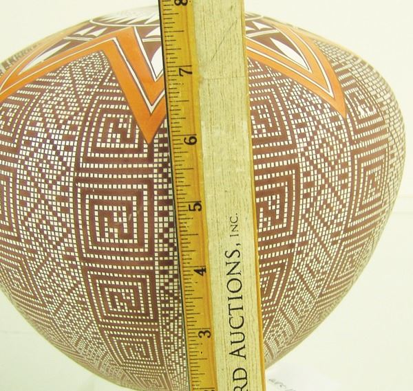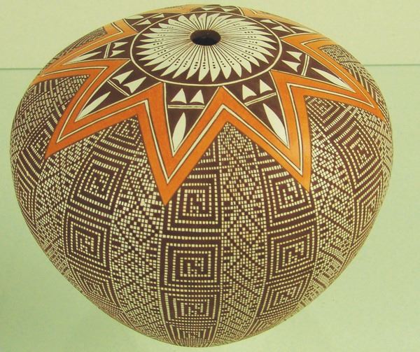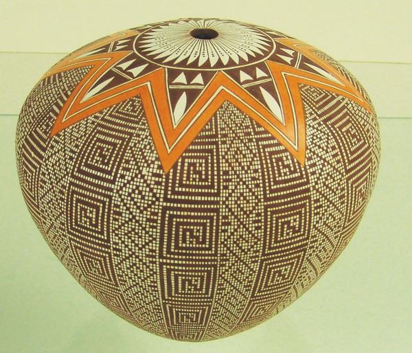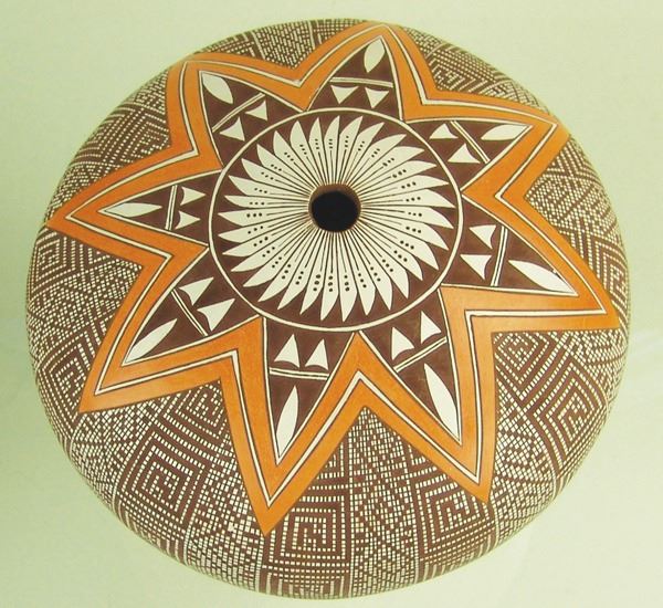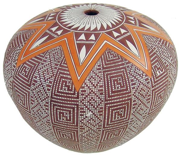 Extra-fine, globular polychrome seed jar with intricate, hatched and checkered body, and orange star burst top. Very good condition, a few tiny pits.Late 1900s7-1/2" x 9"