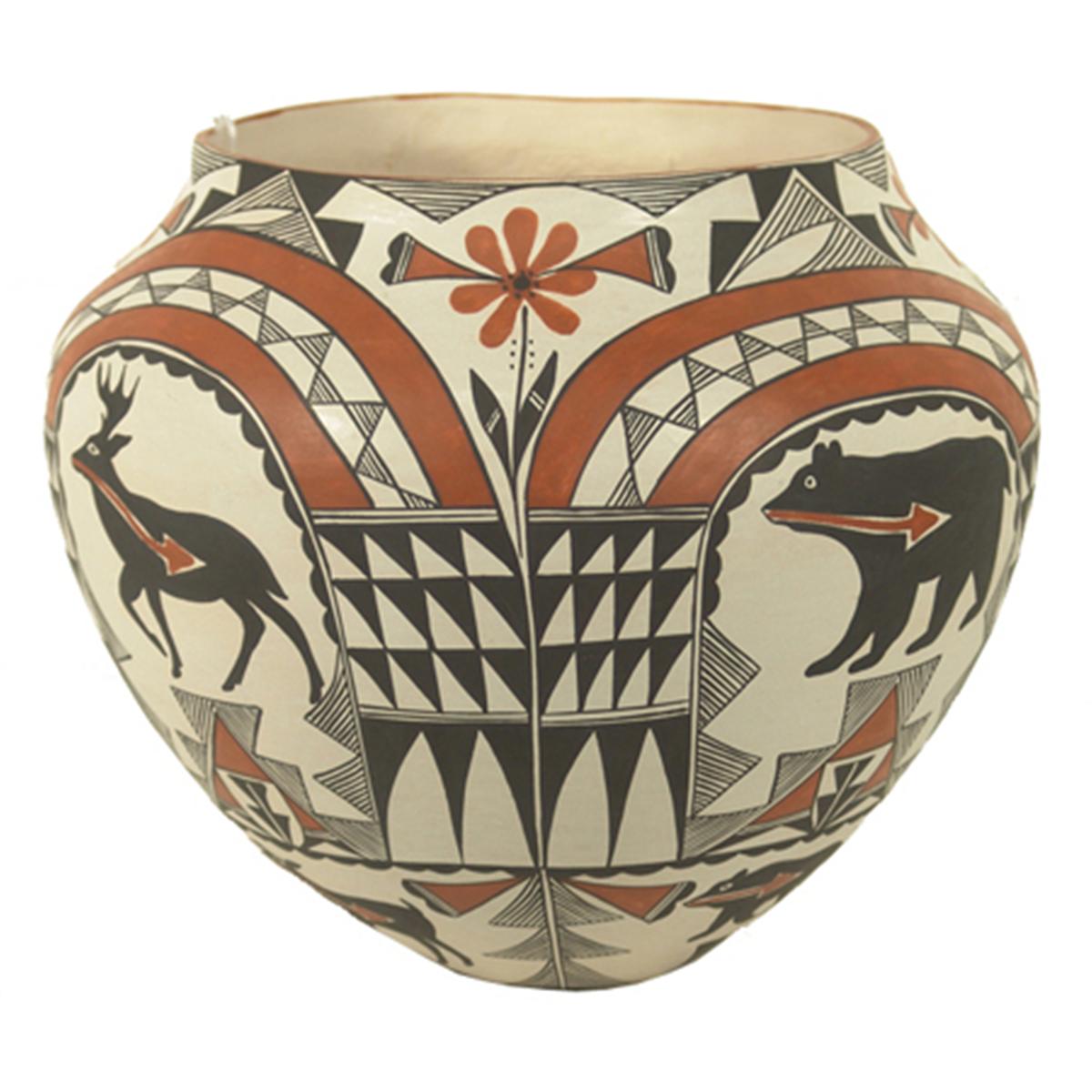Polychrome jar with florals, geometrics, and heartline bear. 10-1/2" x 12"