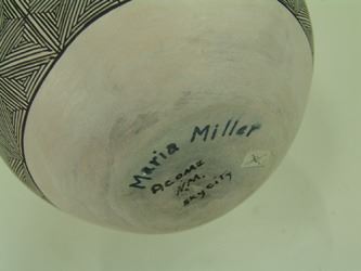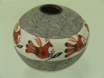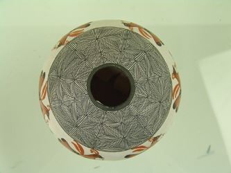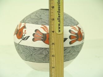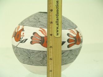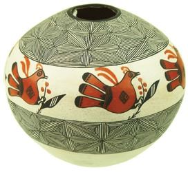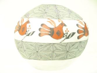 Fine, thin walled pottery seed jar with a row of traditional, polychrome parrot figures between wide bands of fine line motif. Very good condition, shows minor handling. Ca. 1980s. 6" x 7"