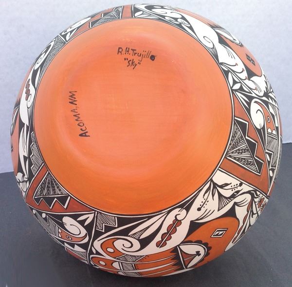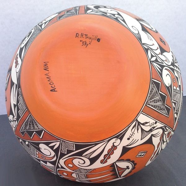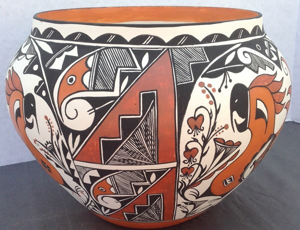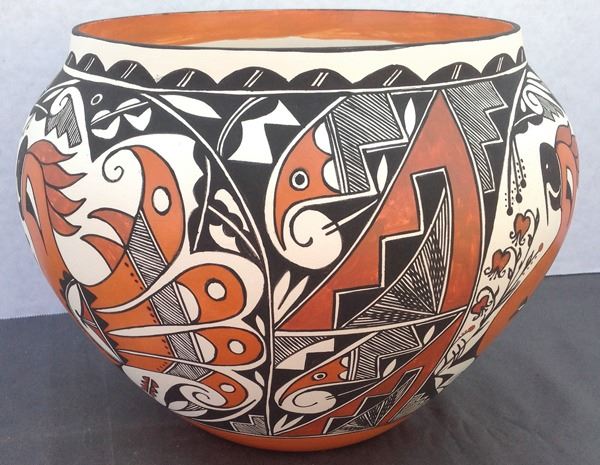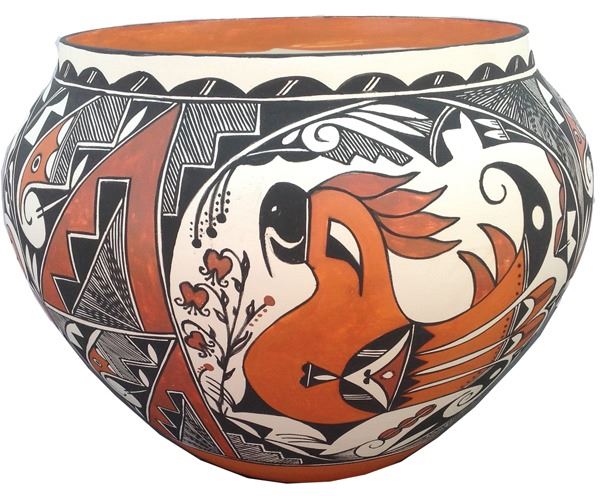 Late 1900s 7-1/2" x 10" Classic, thin walled polychrome jar with parrot figure and other traditonal figures and symbols. Very good condition.