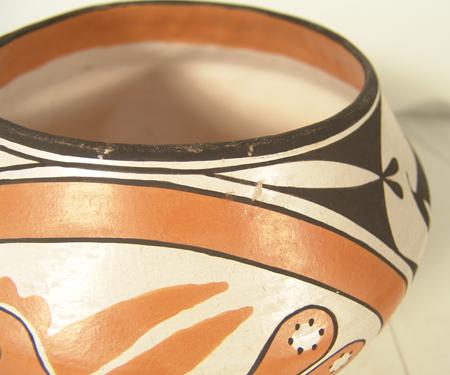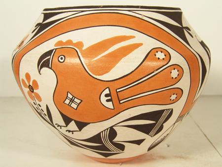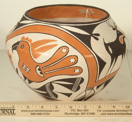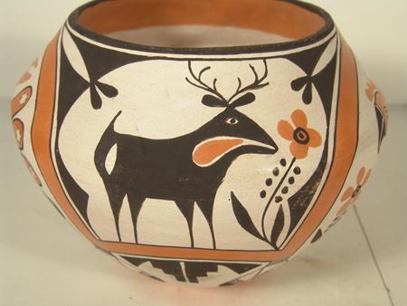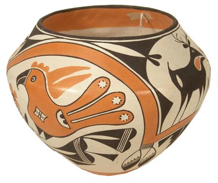 Classic design polychrome pottery olla with parrot and deer figures and other traditional designs. Condition: very good, light handling. 7" x 9"