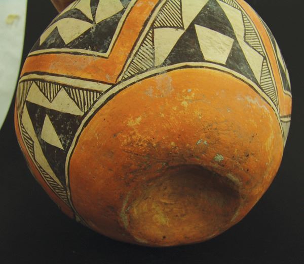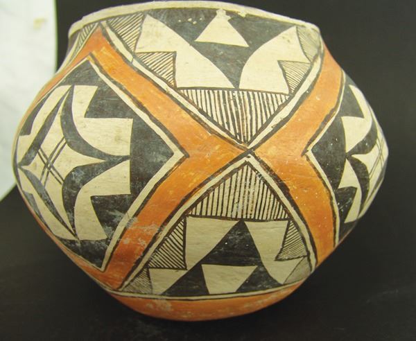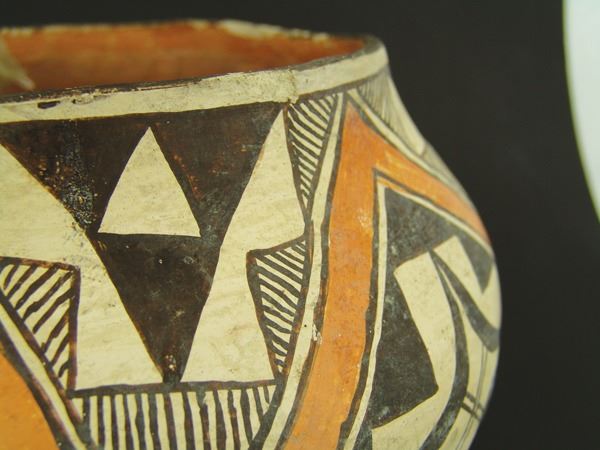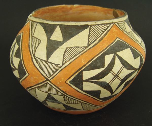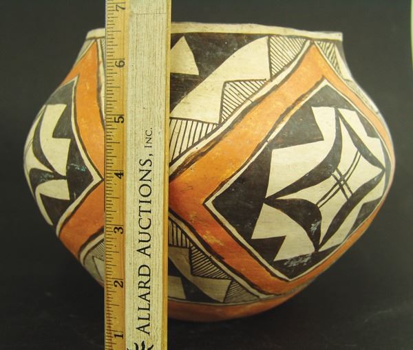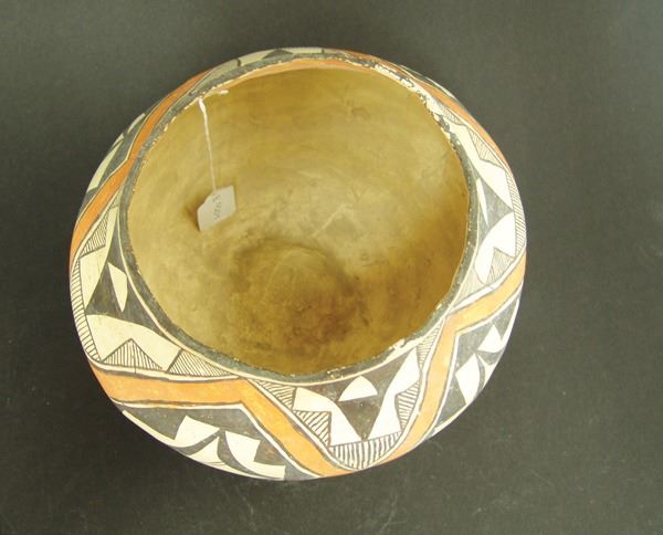 Wonderful, early, polychrome jar done in wide mouthed olla style with traditional geometric and fine line design. Good condition, in tack, shows actual use.Early 1900s7-1/2" x 10-1/2"