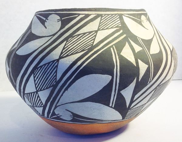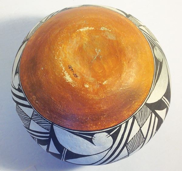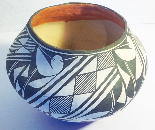 Traditional, thin walled, polychrome pottery jar with fine line and floral motifs. Very good condition, minor scuffs.Mid 1900s5" x 7-1/2"