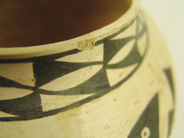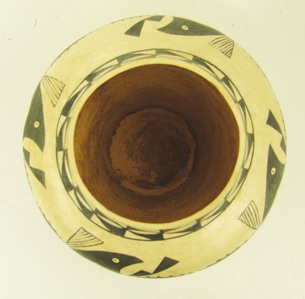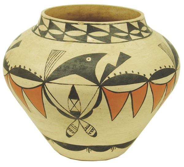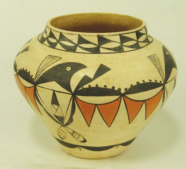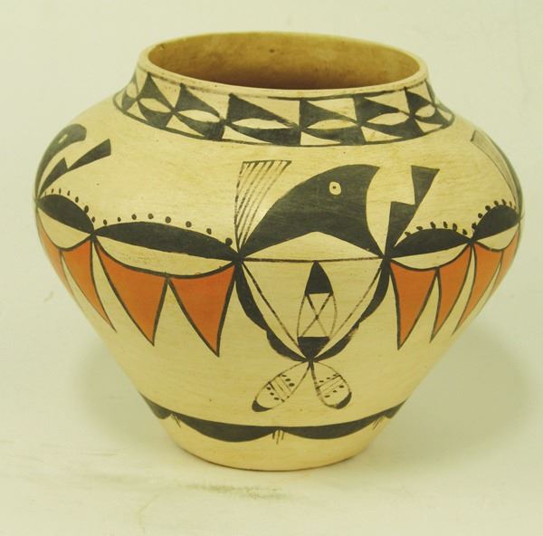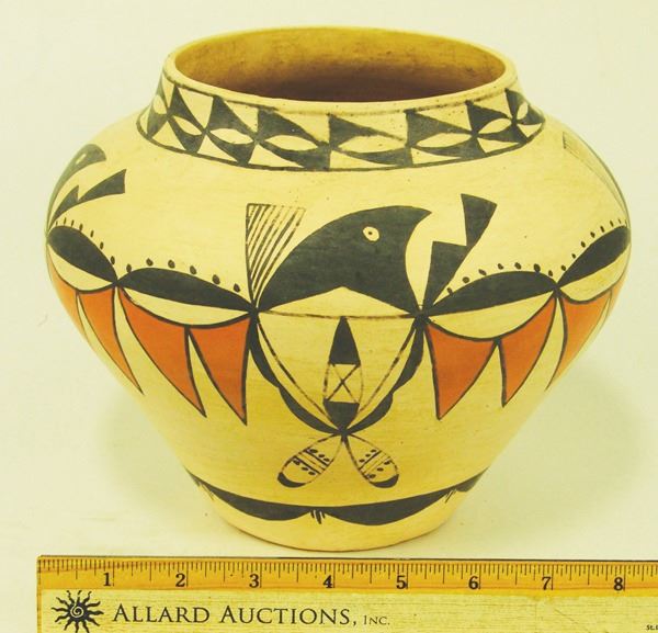 Unique, flat-based, polychrome pottery olla with traditional avian inspired motif. Good condition, shows use and has a small rim chip. Unsigned.Mid/Late 1900s8" x 9-1/2"