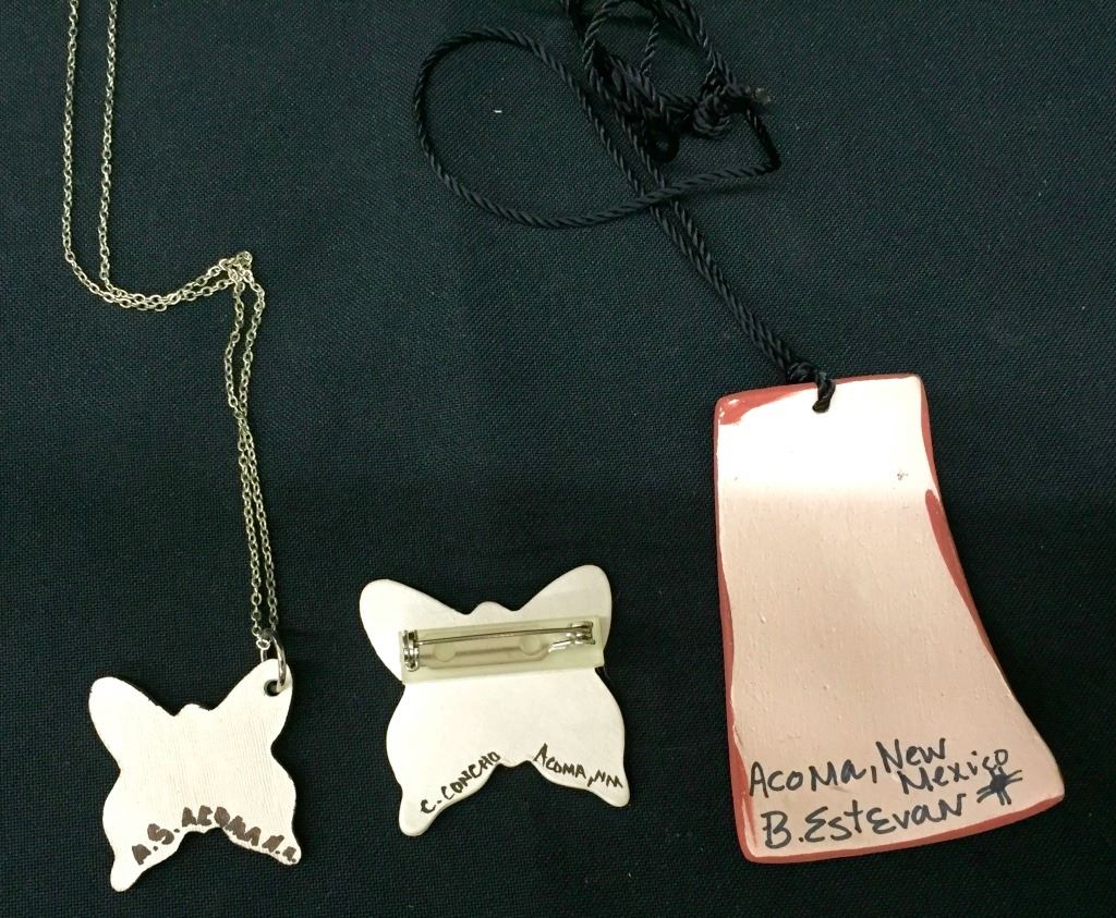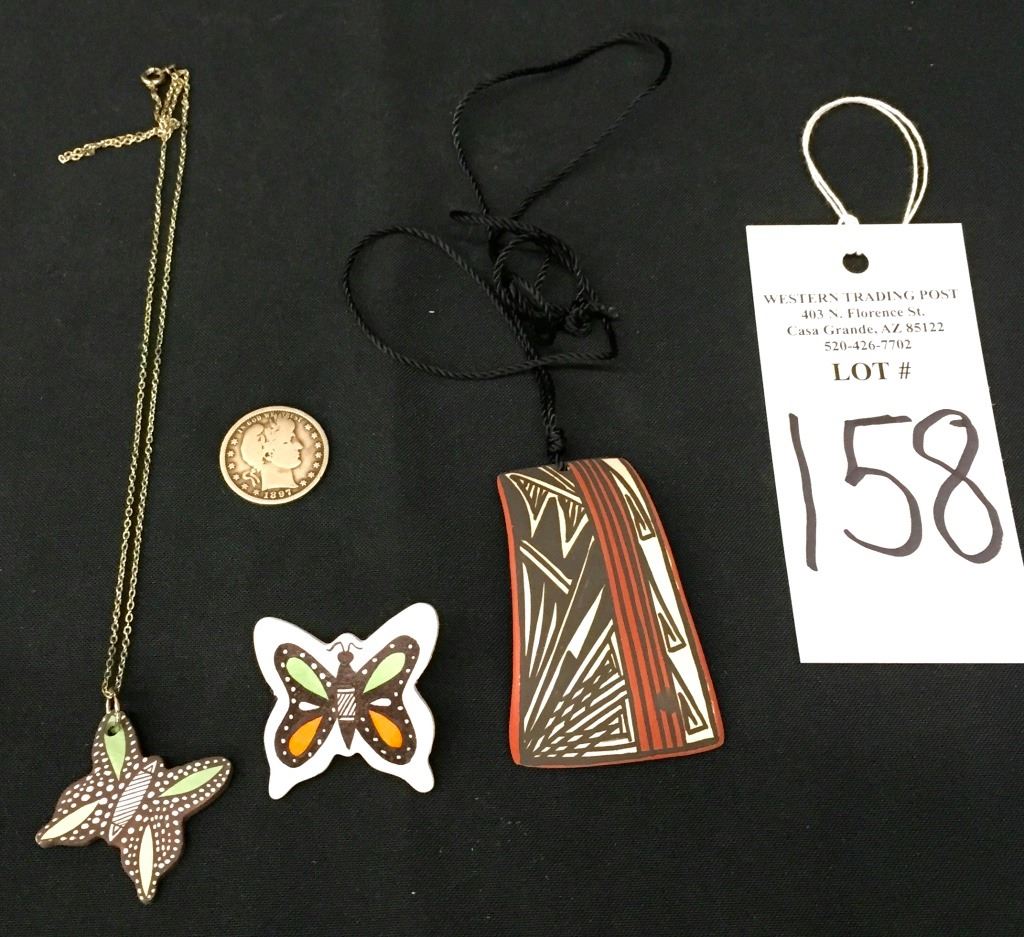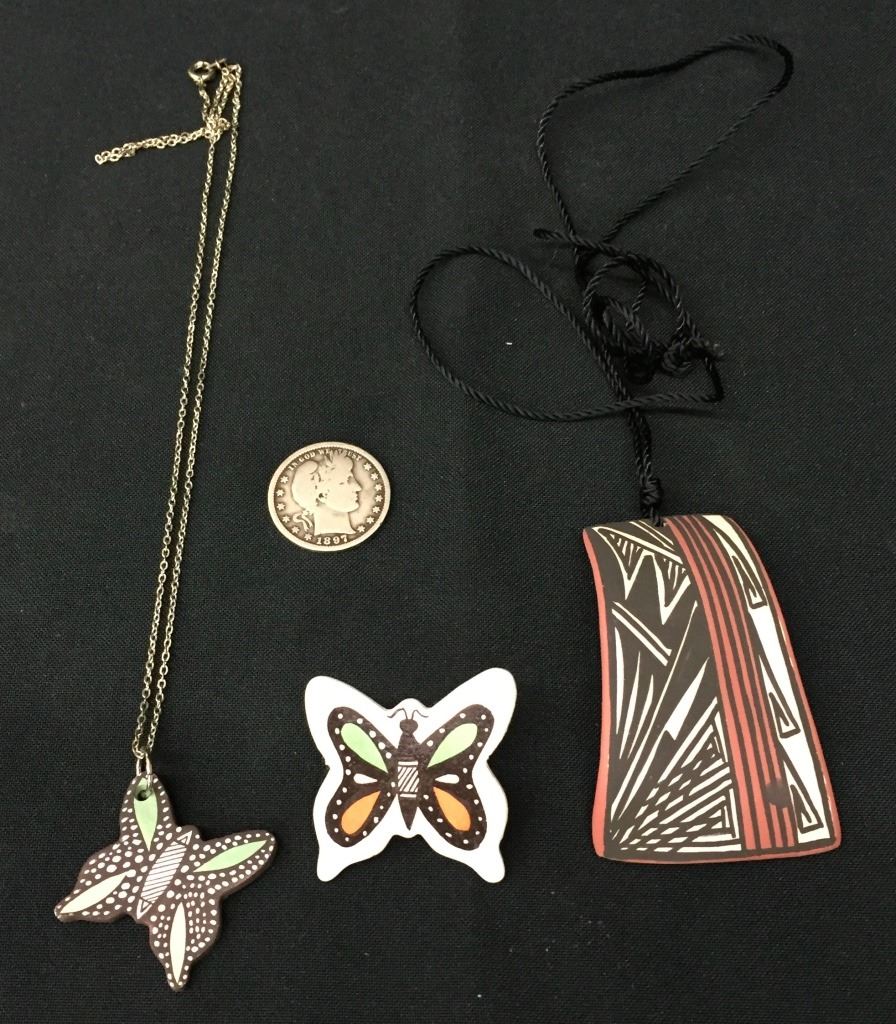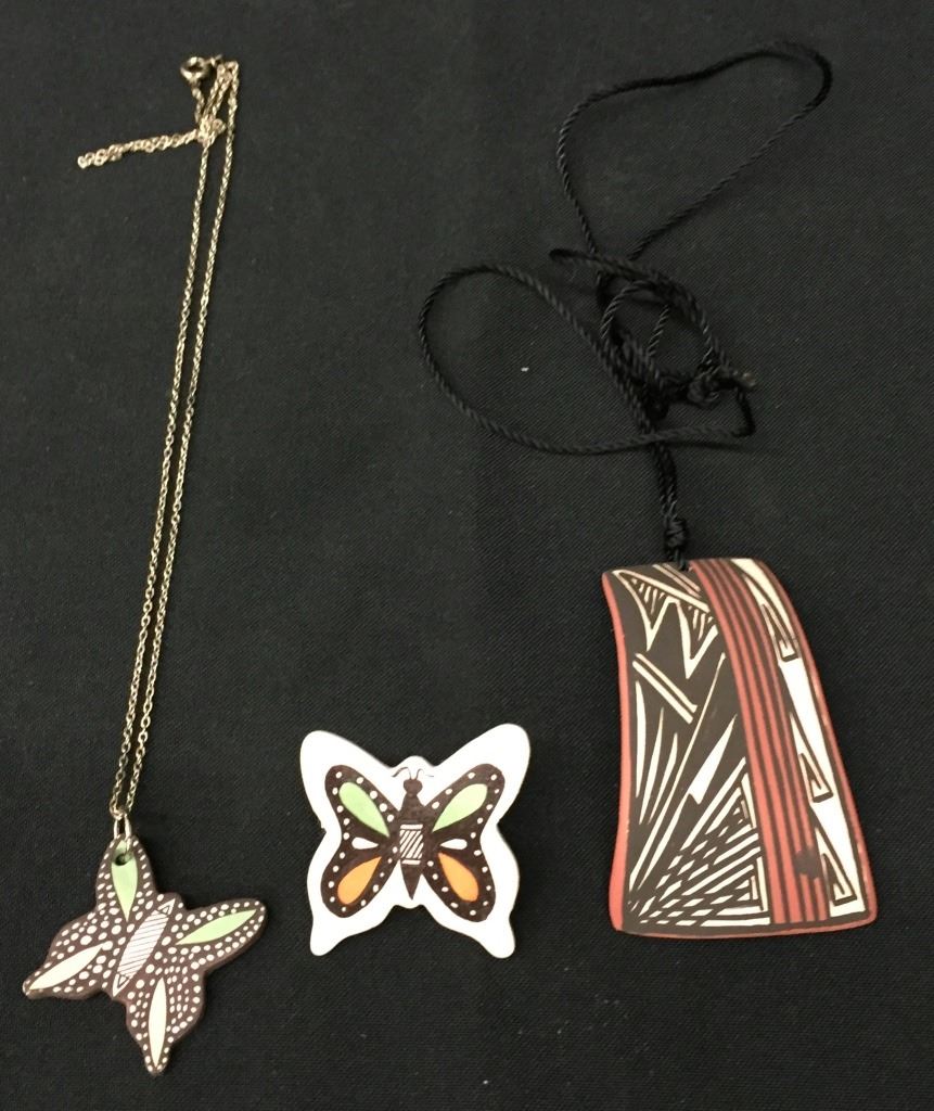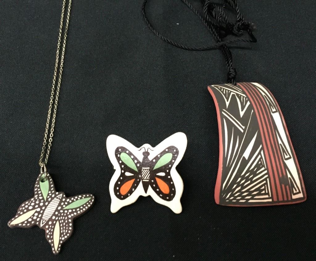 Made in the same hand crafted, hand-painted manner as the clay pottery. The butterfly pendant comes on and 18 inch sterling chain. All pieces are signed. Please look closely at pics - they are an important part of our description. Shipping: There will be a $7 handling / packaging fee for shipping this lot. The actual cost of postage will be added on top of that.