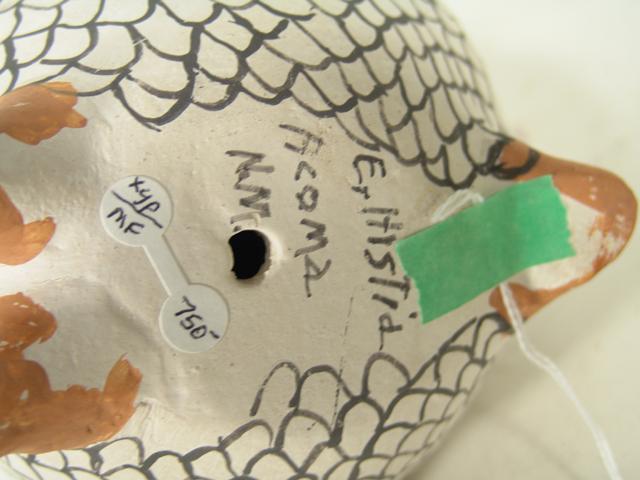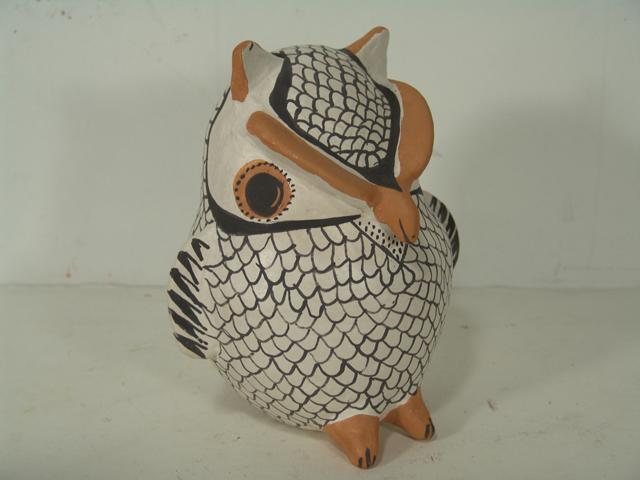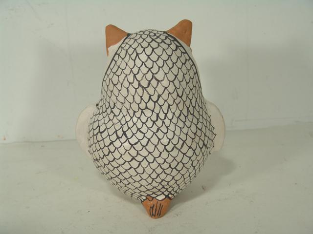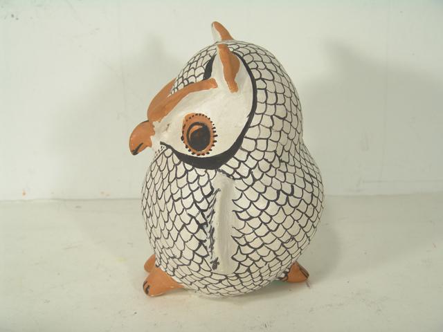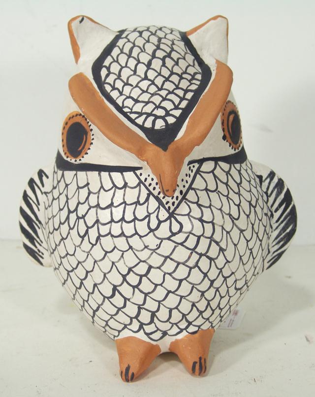 Eva Histia, Unusually large-sized horned owl figure done in polychrome with protruding features. Condition: very good, light handling. Circa 1970s. 10" high