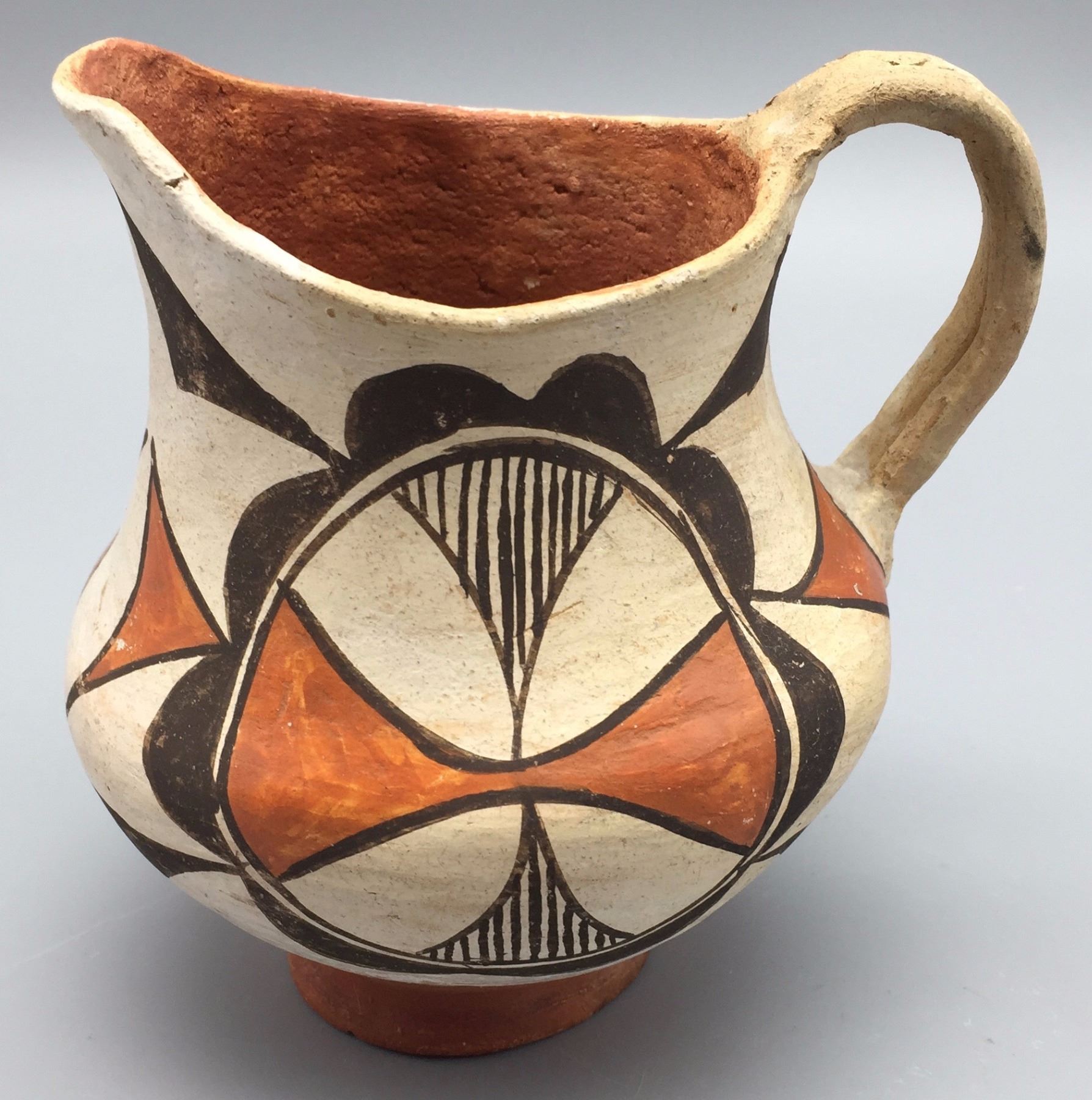 Maker: Unknown. Approx. Age: Circa 1940s. Size: Measures approx. 5” at it’s widest x 5 1/2” tall. Additional Info: Nice, handmade/hand-painted Acoma pottery pitcher. Condition: Good for its age, normal wear and fading expected. Please look closely at the pictures - they are an important part of our description. Shipping: There will be a $8 handling / packaging fee for shipping this lot. The actual cost of postage will be added on top of that.