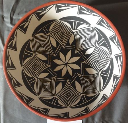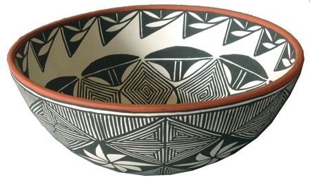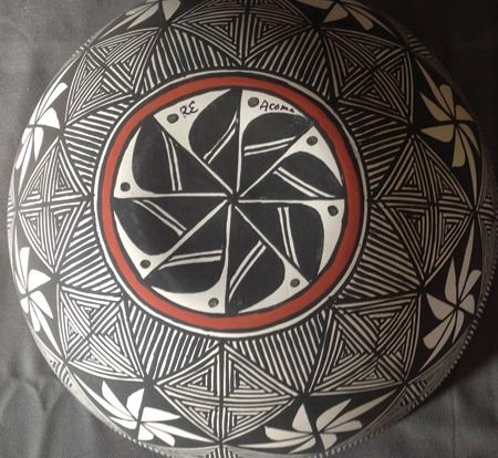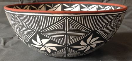 Ca. 2017, Shallow Acoma Pueblo pottery bowl with red rim and designs inside and out. 3-1/2" x 8-1/2"