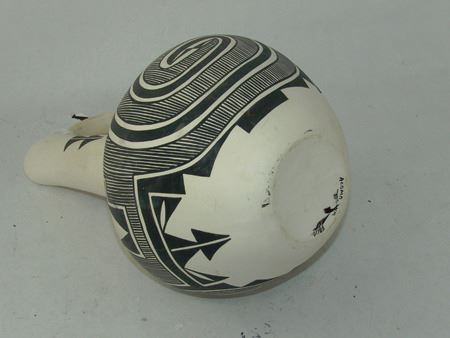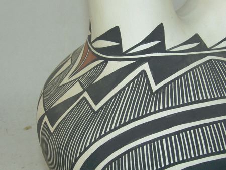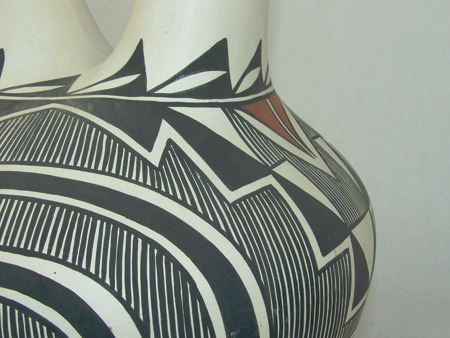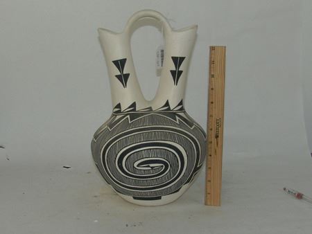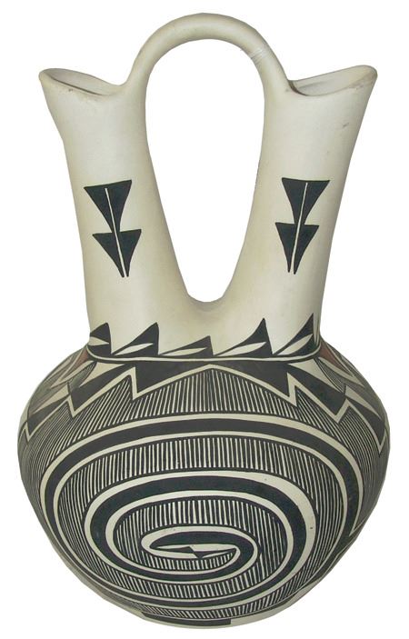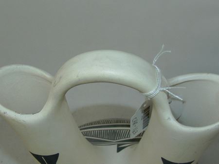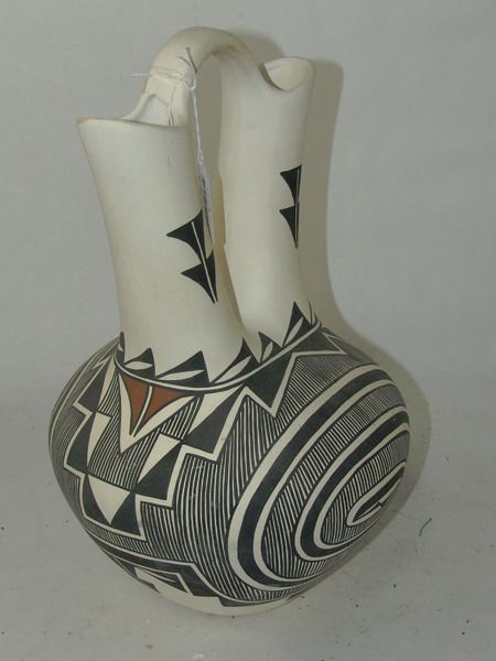 Late 1900s, Traditional design greenware pottery jar, a double-necked wedding vase. Very good condition. 15" x 9"