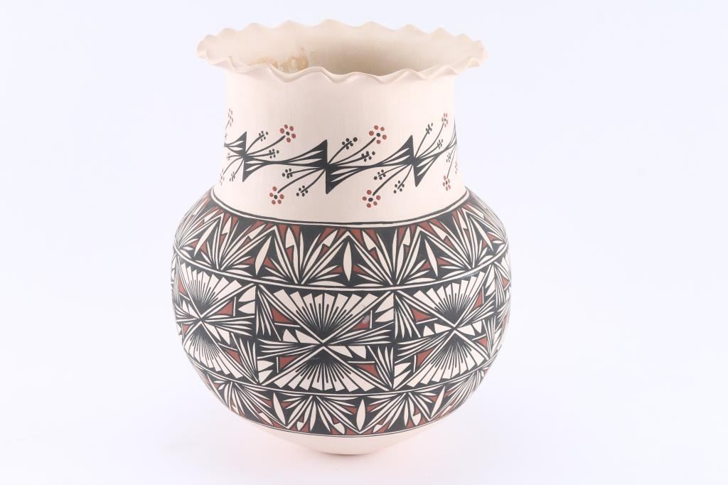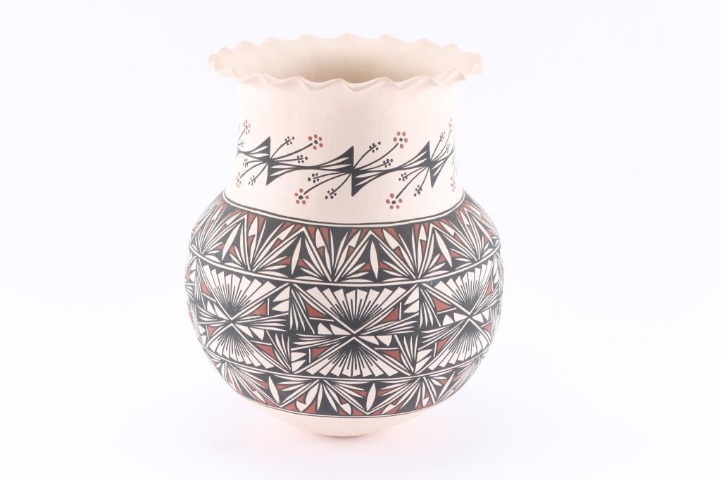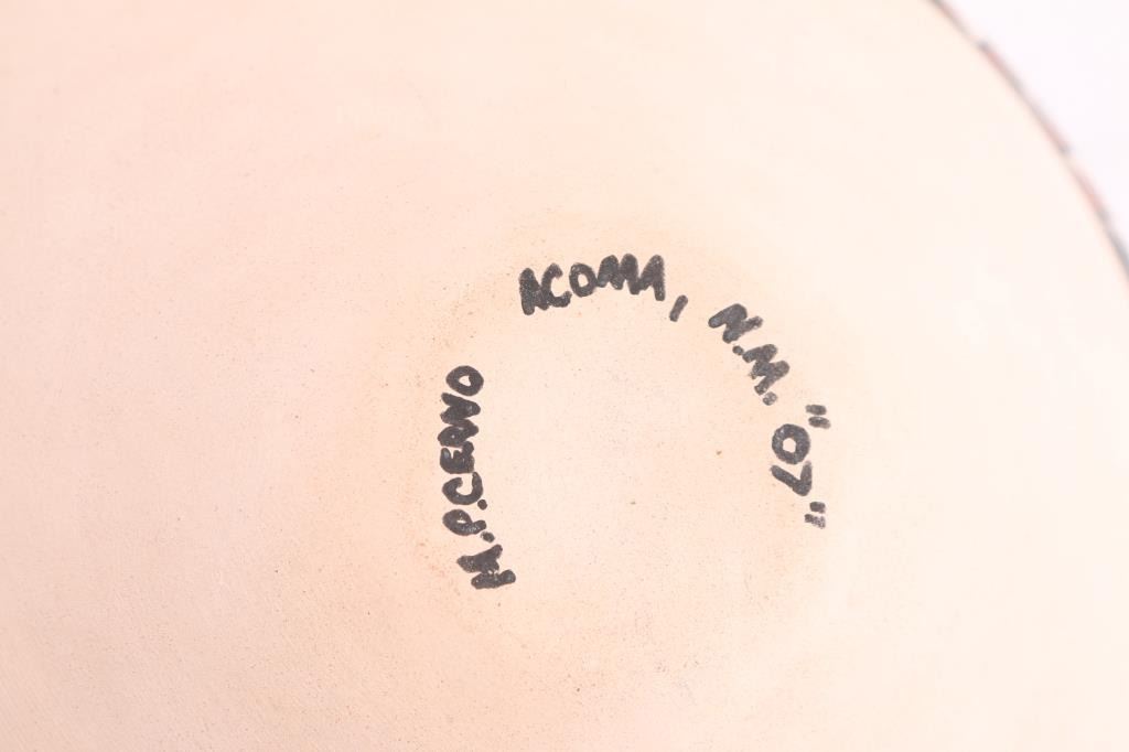 From New Mexico, dated '07. Signed M. P. Cerno. Beautiful red and black design with tufted rim. Bottom not flat so must use round pottery stand to sit upright. Measures approximately 10" tall by 8" wide.
