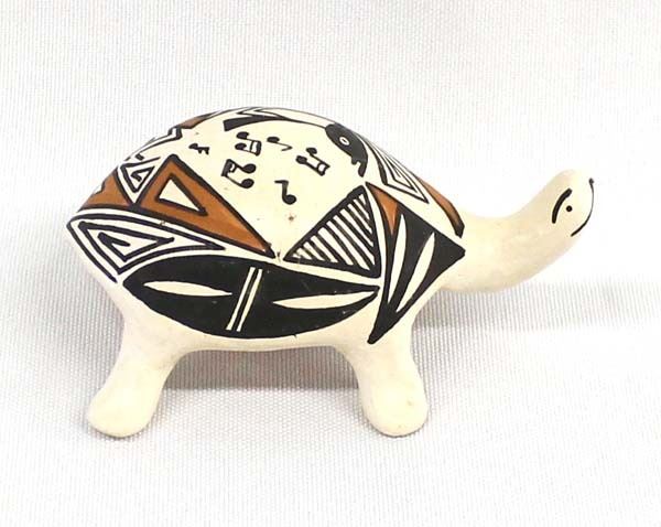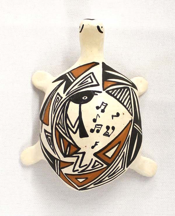 Native American Acoma Pueblo Pottery Turtle by B. (Berleen) Estevan, measures 2.75'' x 3.25'' and is signed underneath, hand painted Kokopelli on back along with geometric lines and designs, FYI: ''She was born into the Acoma Pueblo in 1975 and has been working with pottery since 1985, at the age of 10. While the late Lucy Juanico (her grandmother) taught Estevan the traditional way to make pottery, Estevan has developed a style of her own. Her handpainted greenware and hand coiled pottery is painted with kokopelli, animals, mimbres, angels and pottery designs. Estevan signs her pottery: B. Estevan, Acoma, N.M.'', Sweet!!!