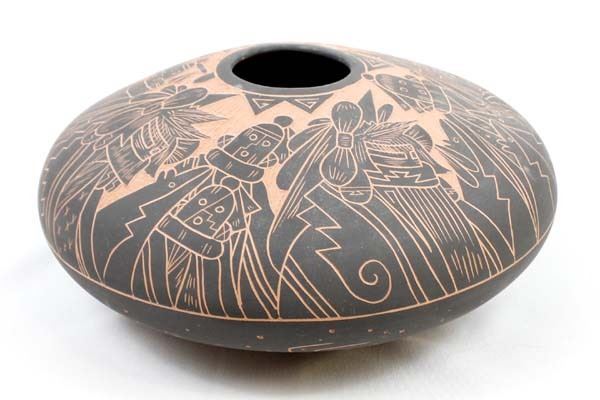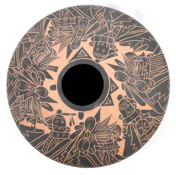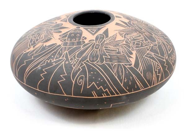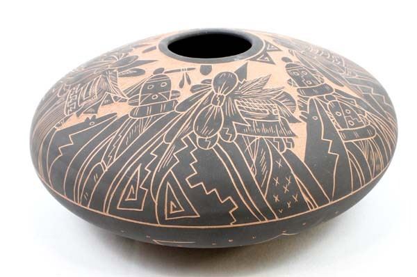 Native American Acoma Sgraffito Ceramic Pottery Bowl by Anthony Concho, measures 5'' x 10'' and is signed on the bottom, features several different types of Kachinas, very intricate details, incredibly carved, does have shelf wear on the bottom, truly a work of art