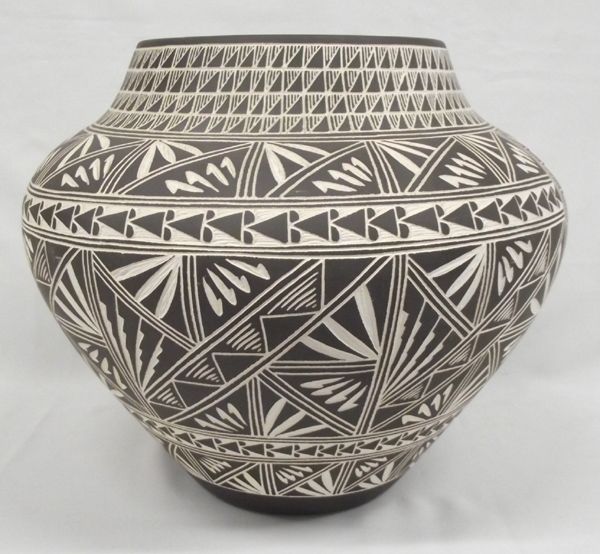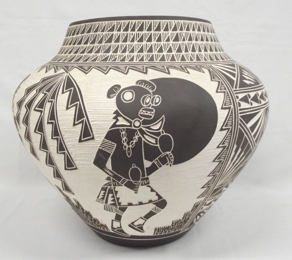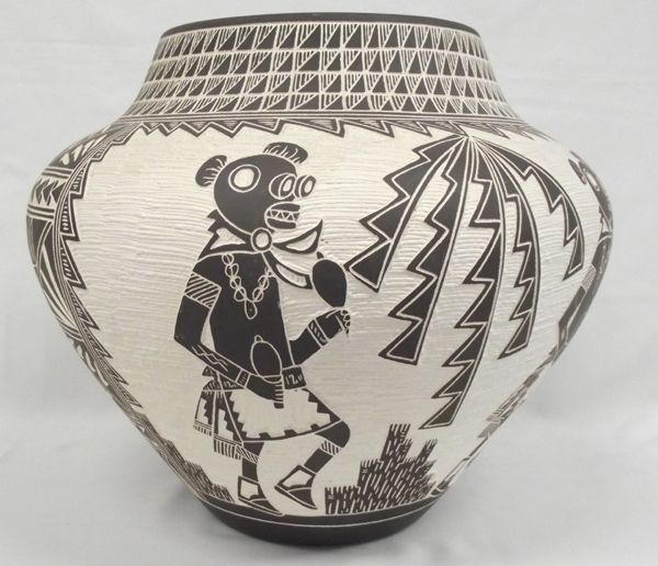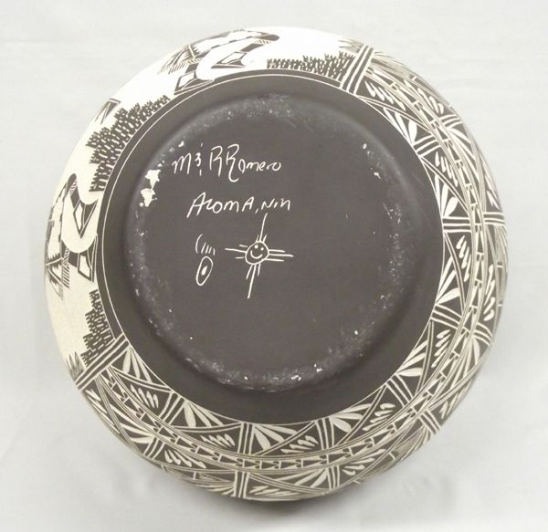 Native American Acoma Sgraffito Olla by M. & R. Romero, signed on bottom ''Acoma, NM'' with bear paw and Zia sun symbol. This huge pot is skillfully crafted in geometric designs, at the focal point of this exquisite piece are two dancing Kachinas in costume with rattles, measures approx. 13.5''H x 14''W, would make a great addition to your collection.