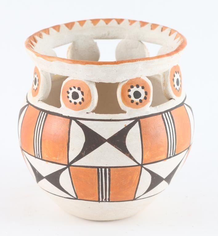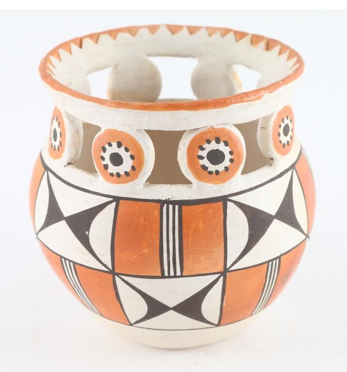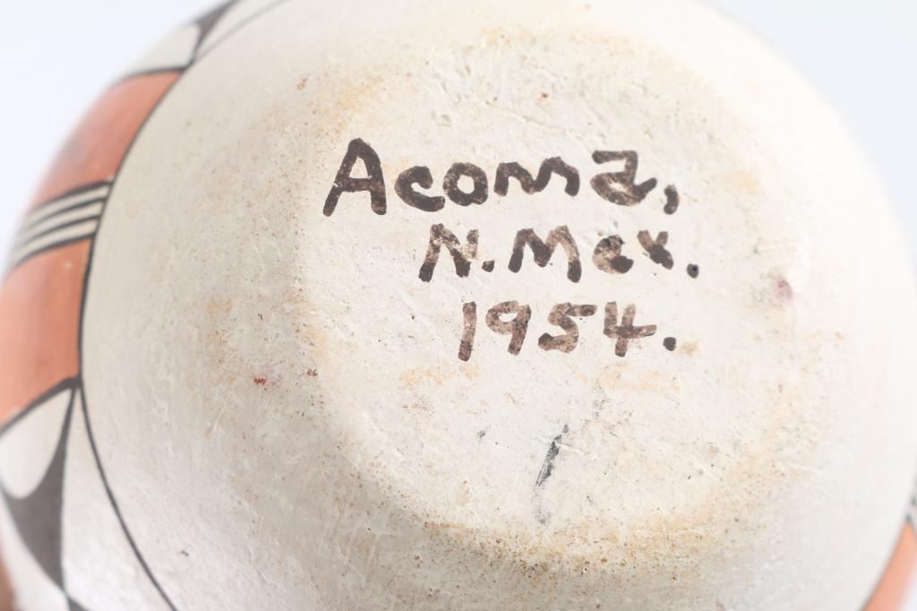Marked on bottom "Acoma Circa 1954" carved geometric rim on the jar, with black, white an orange colors. In good condition. Approx 4" tall, 3.75" diameter across top.