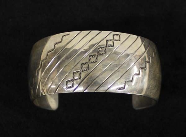 Native American Acoma/Navajo Sterling Silver Cuff Bracelet by C. Levaldo of Shiprock NM, stamped sterling and hallmarked, inside measures 6.5'' which includes the opening x 1''W, total wt. of 46.33g