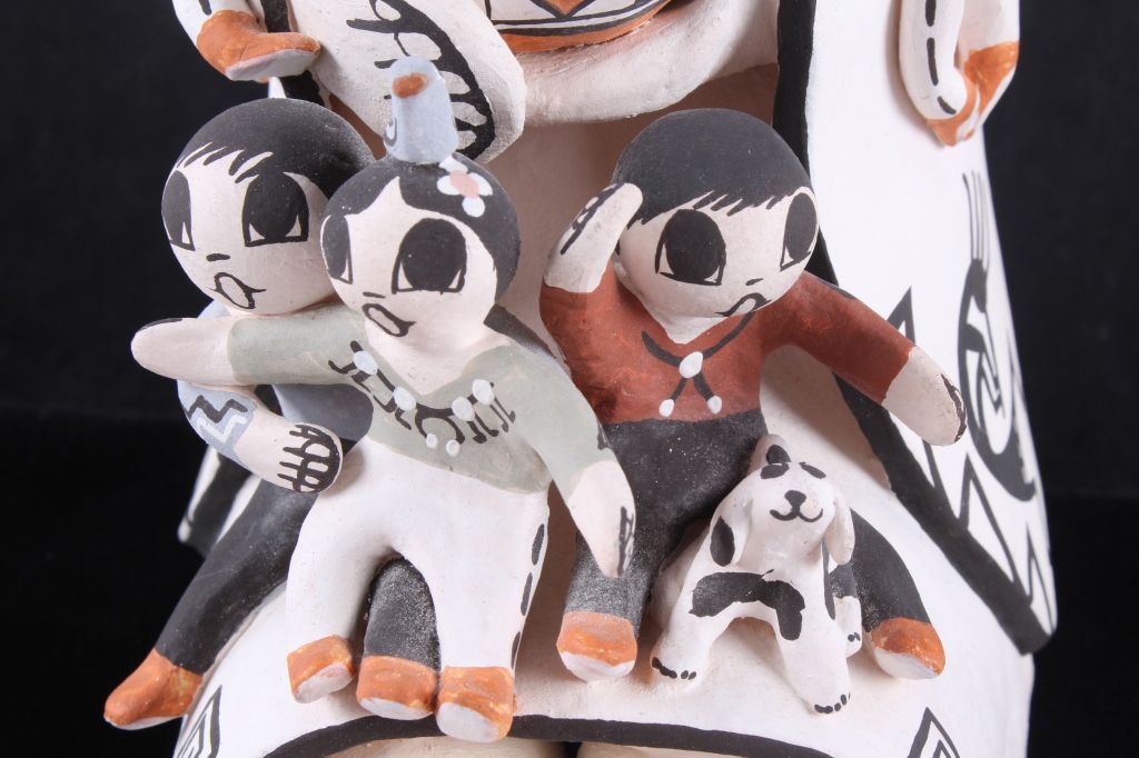 This is an original Acoma Pueblo Native American Indian pottery figure. This is a Storyteller figure and shows a large figure with ten smaller children on its lap with animals and a vase. This is very well made and is signed on the bottom, "'Aggie' Acoma NM. 95." The piece shows a repaired break on the top butterfly and a slight crack on the hand against the vase. Measures 9.5"x4.75"x7.75"