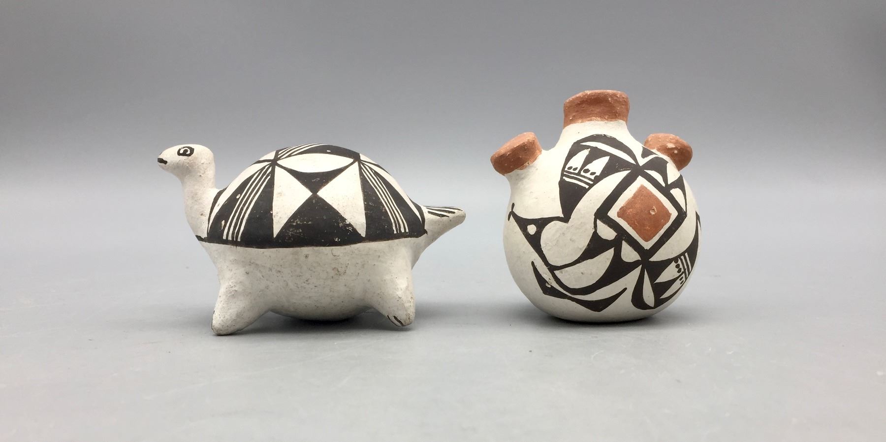 Description: Included for sale in this lot are two Acoma pottery pieces featuring hand painted designs. There is a canteen and turtle effigy.                                                                                                           Maker: One is signed E.Q. Vallo, Acoma, NM.                                                                                                                  Approx. Age: Vintage.                                                                                                            Size: 3-1/2”w x 2-5/8” tall x 2” deep and 2-5/8”w x 2-1/4” tall x 2-5/8” deep.                                                                                                                                                                                                                                 Condition: Good for their ages, normal wear expected.                                                                                                                Please look closely at the pictures - they are an important part of our description.                                Shipping: There will be a $10 handling / packaging fee for shipping this lot. The actual cost of postage will be added on top of that.