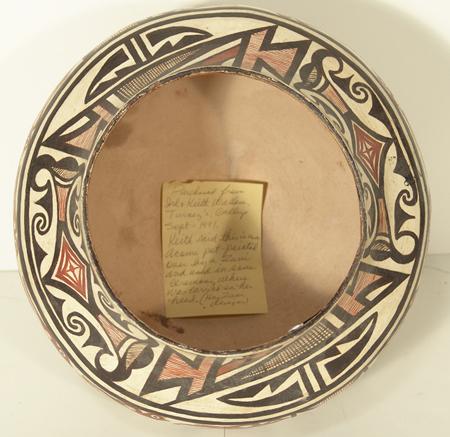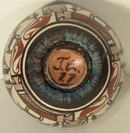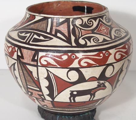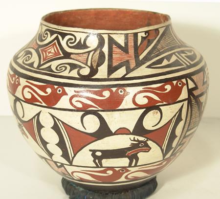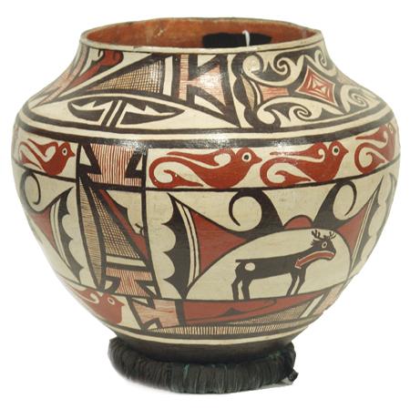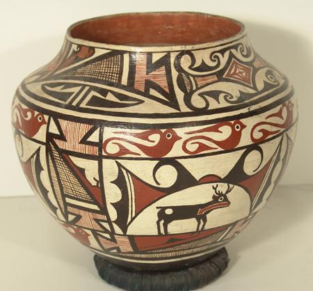 Classic polychrome water jar over-painted in Zuni design in olla shape with heartline deer, red birds, and other traditional designs. Bought at Turney's, Gallup, in 1991; appraisal value $2,400. Repaired rim chip, finish applied overall and headband attac