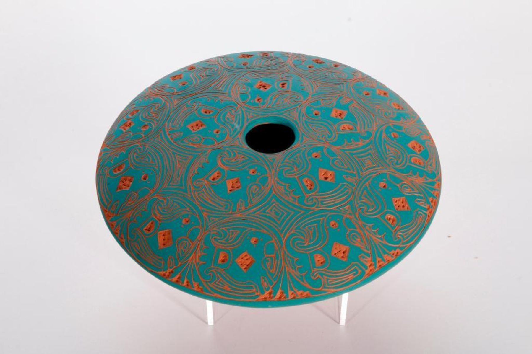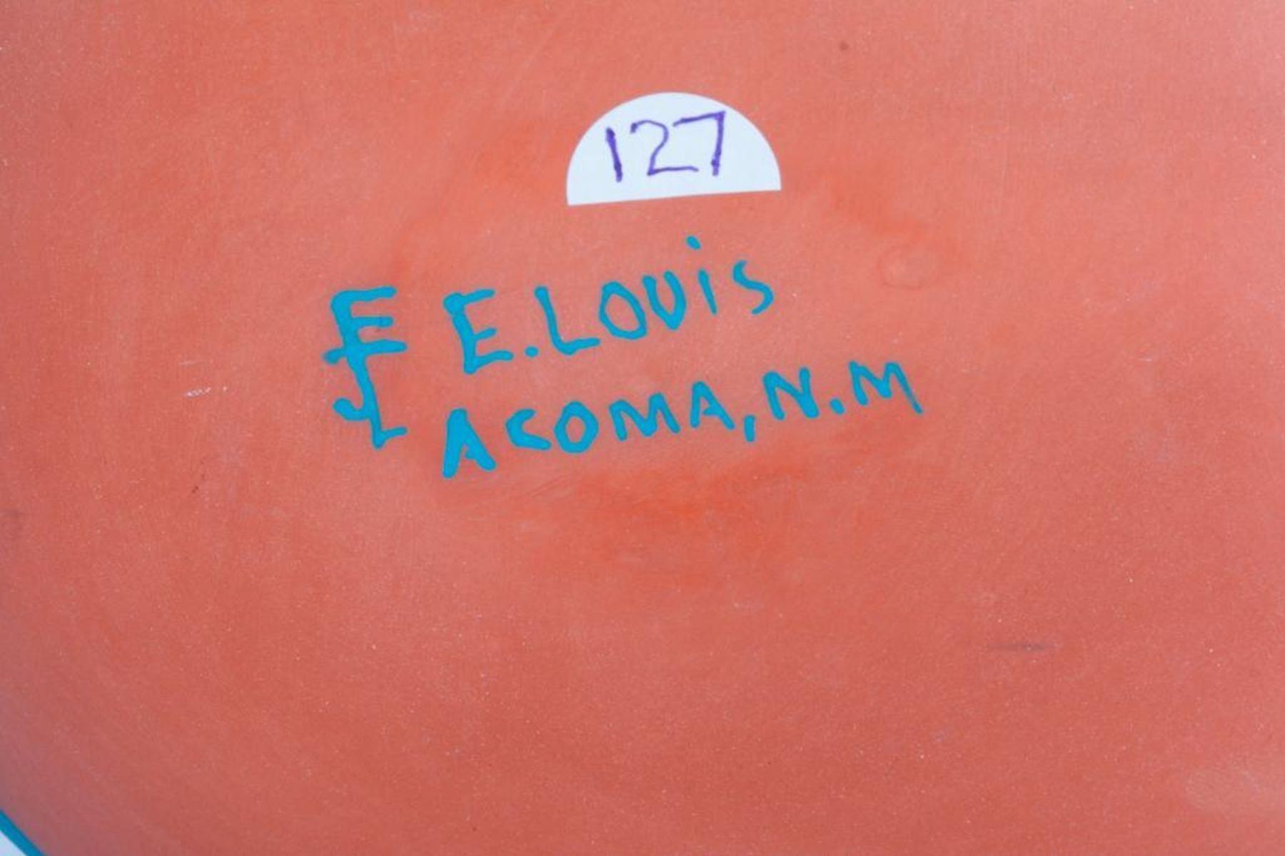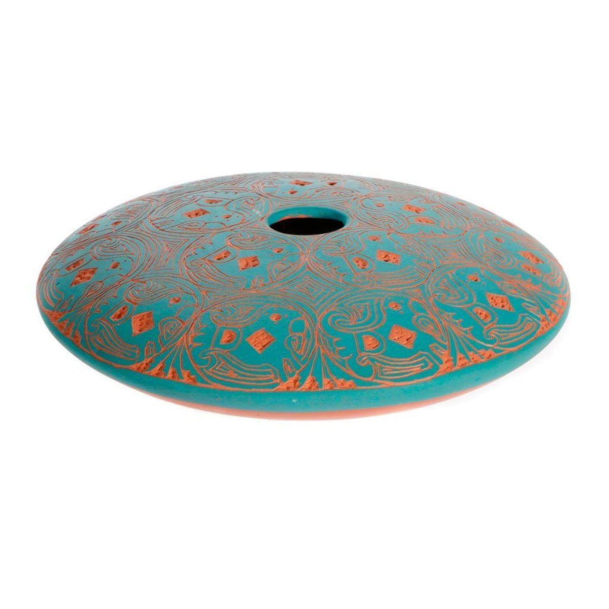 Acoma seed bowl (1 5/8" x 7") by E. Louis; redware with turquoise colored slip and intricate sgraffito design (new condition).