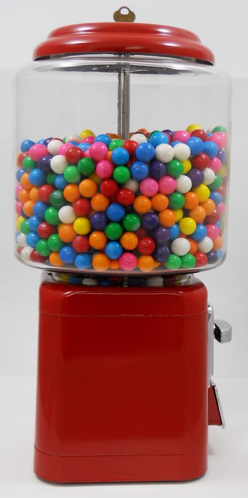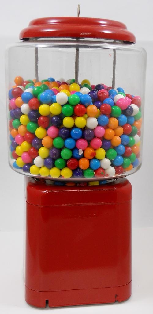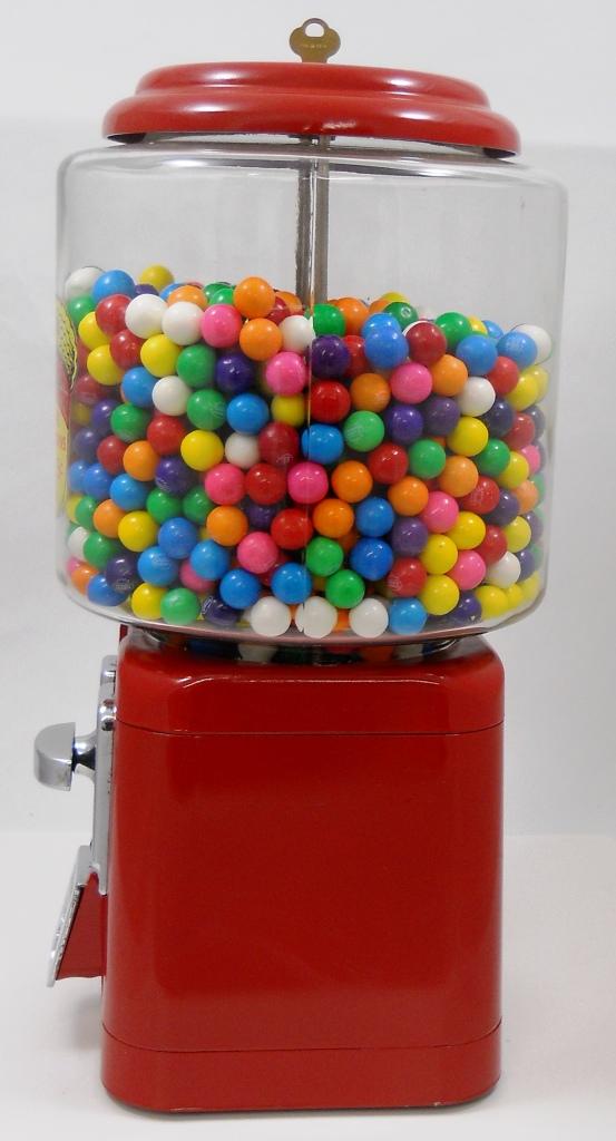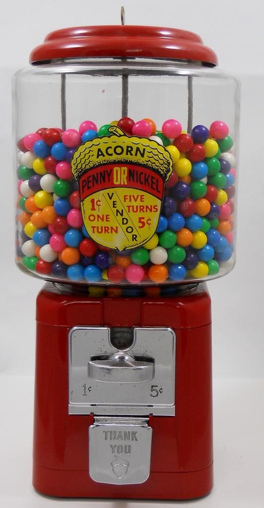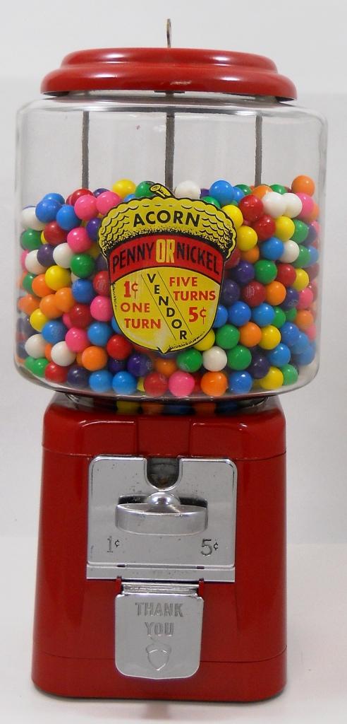 This is a complete, ready to use, fully restored Acorn 1-cent or 5-cent vending machine. It can sell gum or candy....if you use a penny, the handle turns once; if you use a nickel, the handle turns five times. It stands 16 inches tall x 8 inches wide.