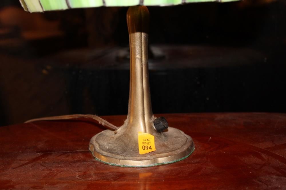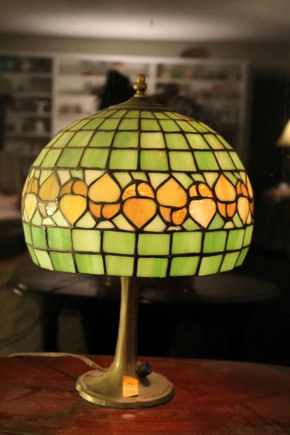 Leaded glass acorn lamp shade with tree trunk looking base. Green, orange and yellow. Approx. 13 inches tall x 11 inches wide.