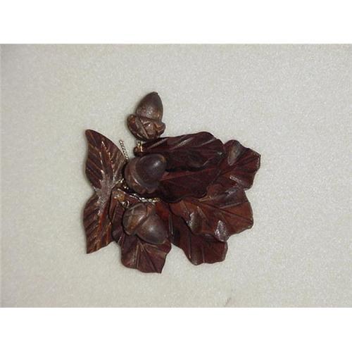 Carved Wood Pin in the form of Oak leaves with three acorns hanging form single leaf by gold colored strings. Pin back, unsigned.