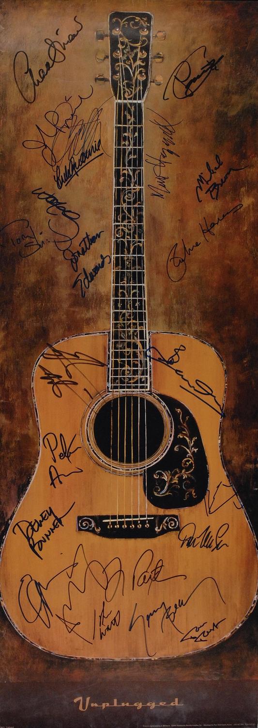 Color 13.5 x 37.5 print of an artist’s work of an acoustic guitar, signed in blue and black felt tip by 24 acoustic greats. Signers are: Willie Nelson, Merle Haggard, John Prine, Don McLean, Richie Havens, Judy Collins, Chad & Jeremy including Chad Stuart & Jeremy Clyde, Emmylou Harris, America’s Dewey Bunnell and Gerry Beckley, Brewer & Shipley’s Tom Shipley and Michael Brewer, Peter & Gordon’s Peter Asher and Gordon Waller, Indigo Girls’s Amy Ray and Emily Sailers, John Hiatt, Tom Paxton, Tom Rush, Jonathan Edwards, and Edwin McCain. Rolled and in fine condition, with some scattered light dings and creases.