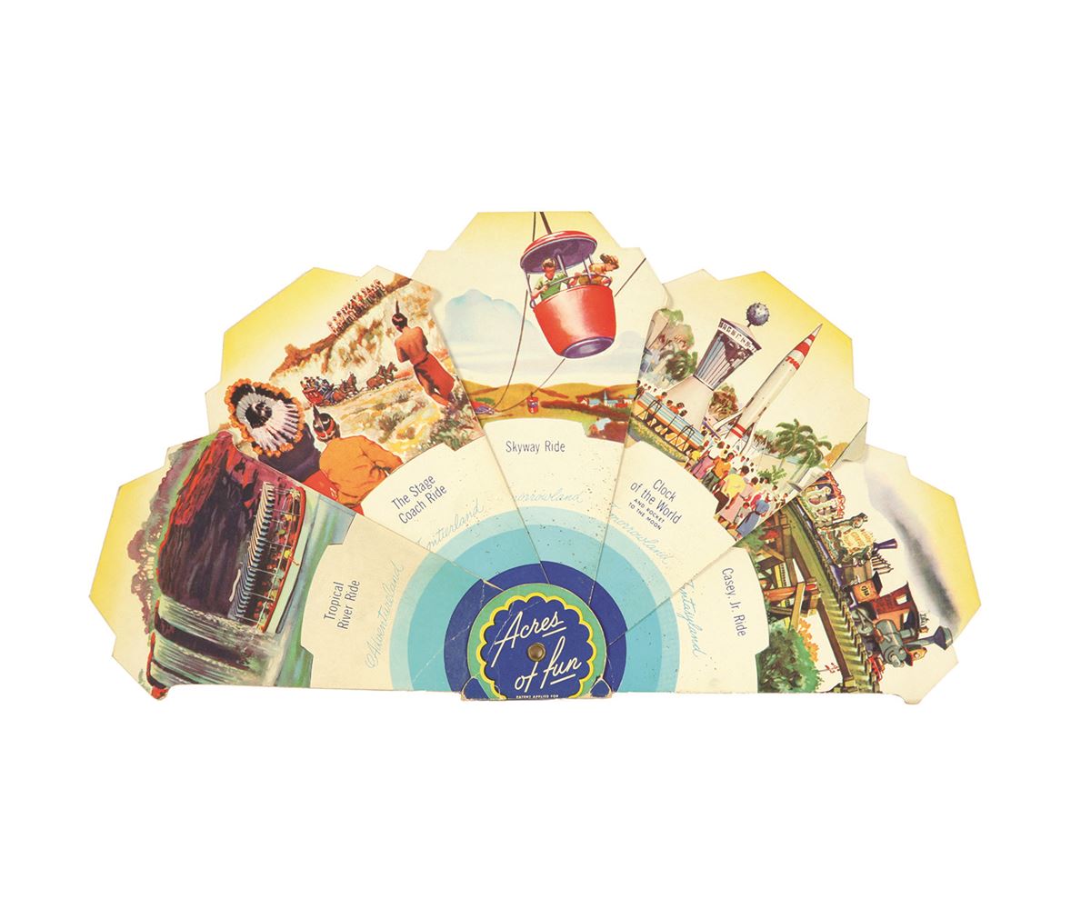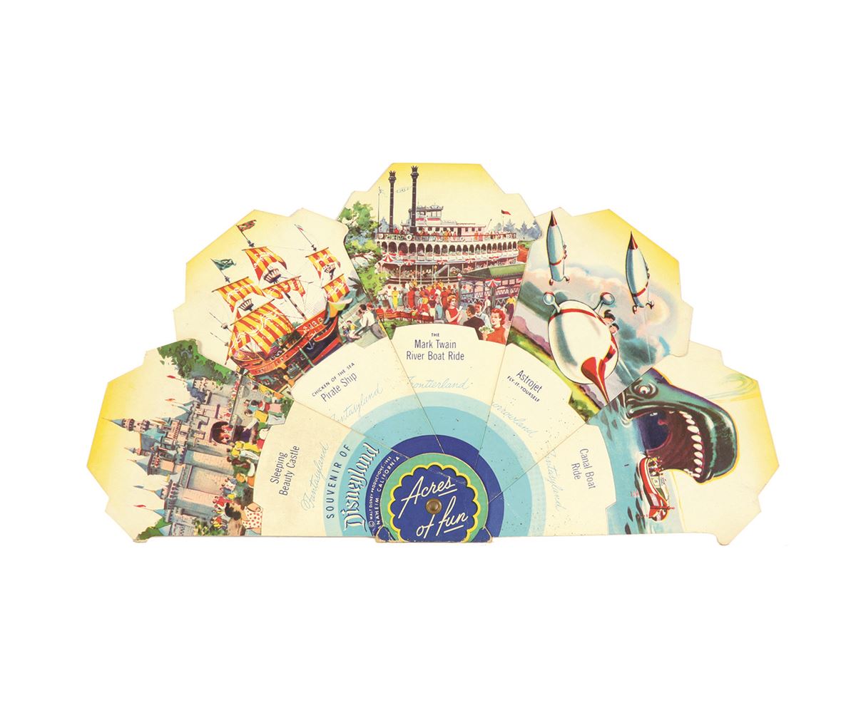 (Disneyland, 1956) A stunning piece of ephemera from the early days of the park. These folding fans were sold at the many souvenir kiosks throughout Disneyland in 1956. Lovingly illustrated on both sides with various attractions. Yet another example of the pride and care Disney put into the promotion of the park through ephemera.