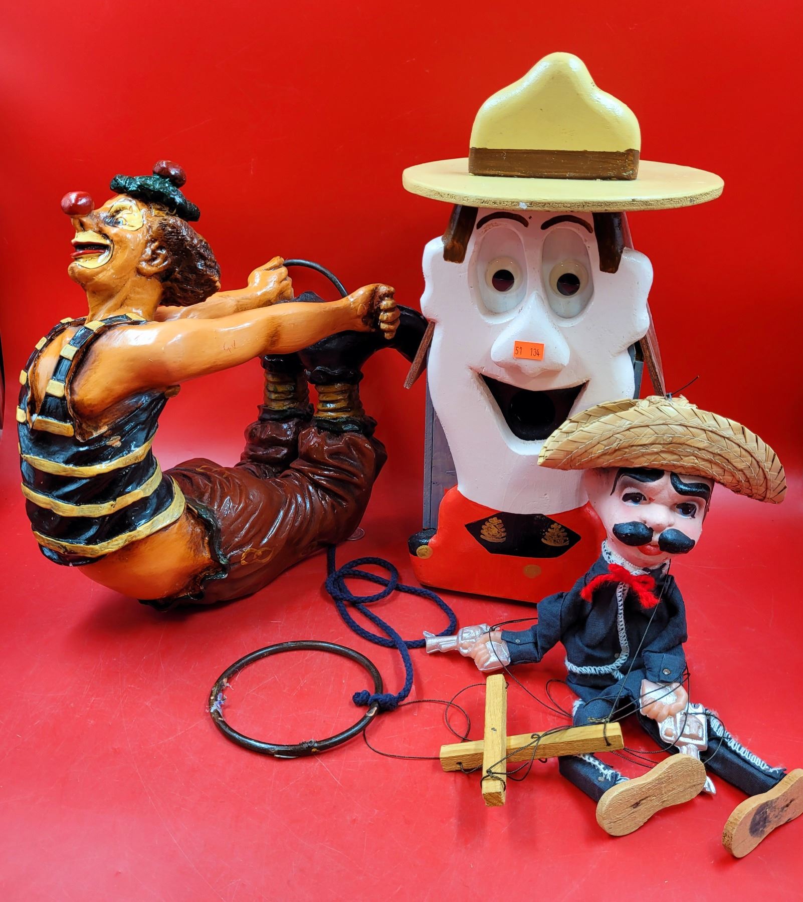 Acrobatic Clown Decor, RCMP Birdhouse, & Marionette Bandito Puppet
