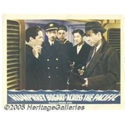 <B>Across the Pacific (Warner Brothers, 1942)</B></I> Lobby Card (11" X 14"). Humphrey Bogart stars in this World War II espionage drama as a U.S. officer whose been court-marshalled out of the army, but in reality is an undercover agent trying to gather intelligence. John Huston reunited his cast from "The Maltese Falcon" in this tale of Japanese saboteurs trying to destroy the Panama Canal. There are chips, bumps, wrinkles and small tears in the borders and light scuffs and one small tear in the graphics. This card offers a nice closeup of Boggy. Fine-.