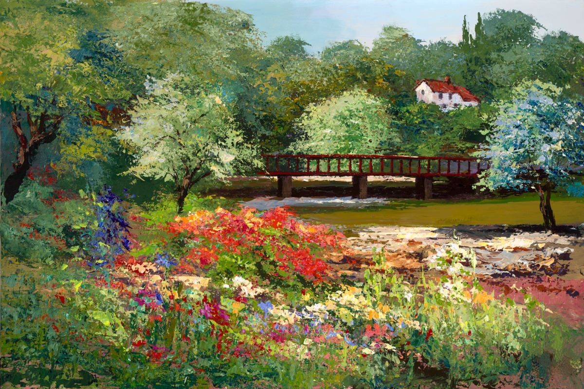 In an homage to his own personal journey from the U.K. to America , the brilliant and renowned Mark King ( 1931-2014) reflects here upon his experiences exploring both continents recording the beauty of so many towns and villages he visited during his lifetime . In dazzling colors this 20x30” giclee on canvas is one of the last limited edition artworks he signed and numbered during his long and celebrated career. It is framed in a stately black molding with a gold trim .