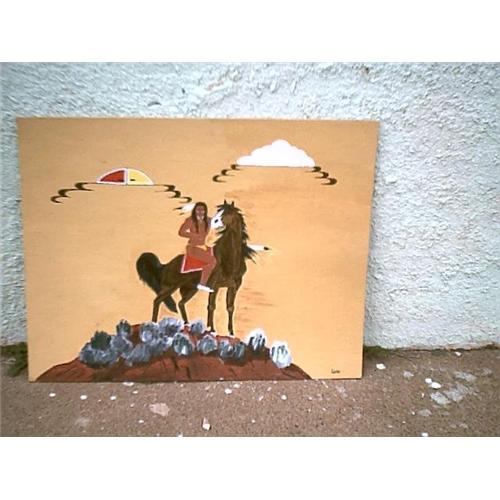 Excellent example of American Indian hand painted art on M. Grumbacher (of Canada) canvas board precoated with Hyplar Gesso. On the back it says that it was painted at F. C. T., at El Reno, Oklahoma. We presume it's from the 1940s. Could be earlier or later. Artists name on back and also signed Leza on front lower right. Artists original price (on back) was $75.