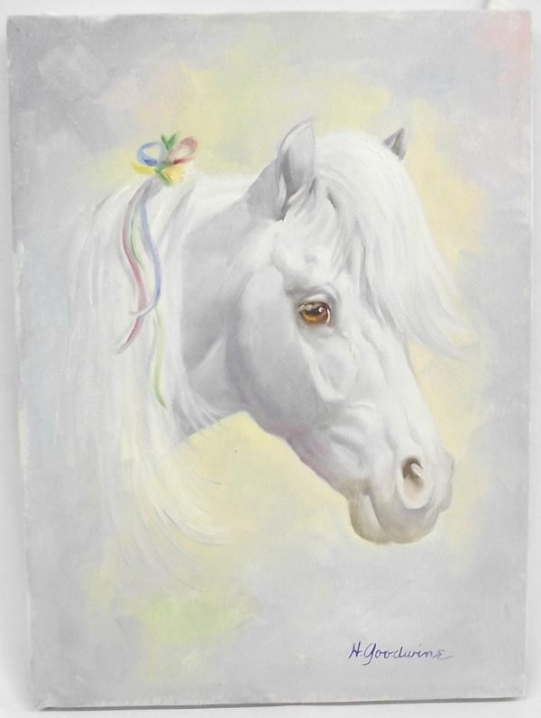 Acrylic Painting Birthday Pony - Helen Goodwine (1918-1998). An endearing pony has ribbon in its mane and a sweet, sweet expression. Measures 16''H x 12''. Painted by Helen Goodwine who is famous for her horse and other animal portraits which have graced the cover of Western Horseman magazine and Leaning Tree greeting cards.