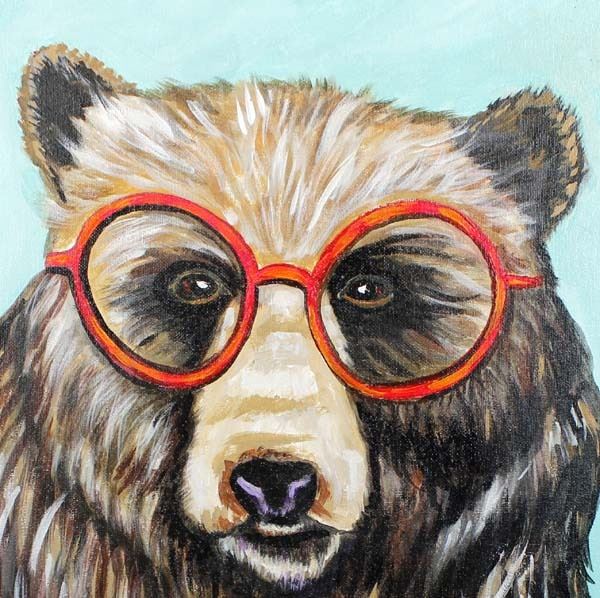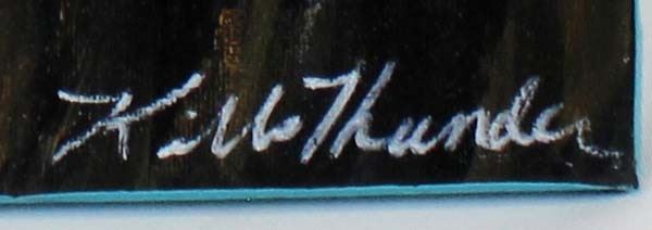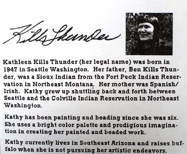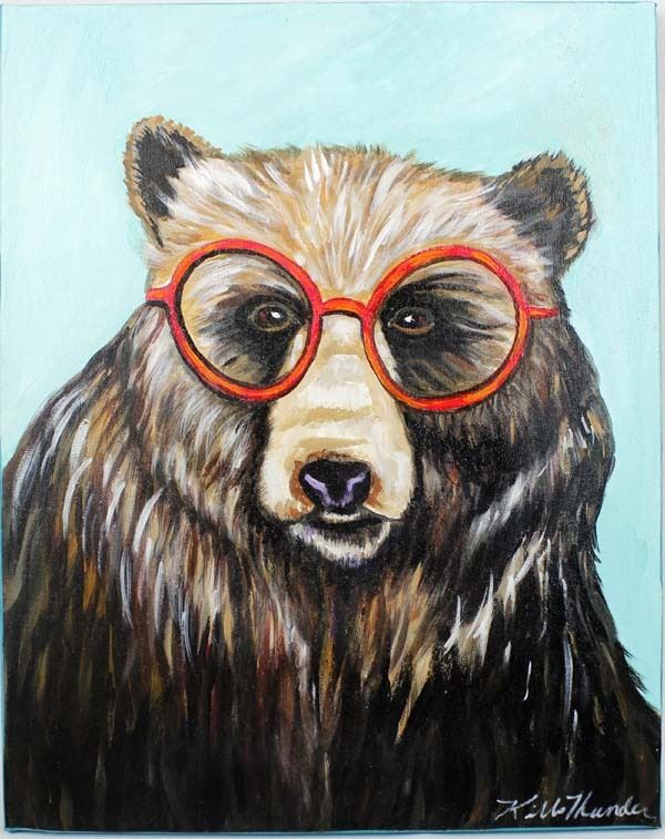 Whimsical Acrylic Painting of Educated Bear by Kathlene Kills Thunder Artist Bio: Kathleen Kills Thunder (her legal name) was born in 1947 in Seattle, WA. Her father, Ben Kills Thunder, was a Sioux Indian from the Fort Peck Indian Reservation in NE Montana and her mother was Spanish/Irish. Kathy has been painting and beading since she was six. Acquisition is in compliance with all state and federal regulations.