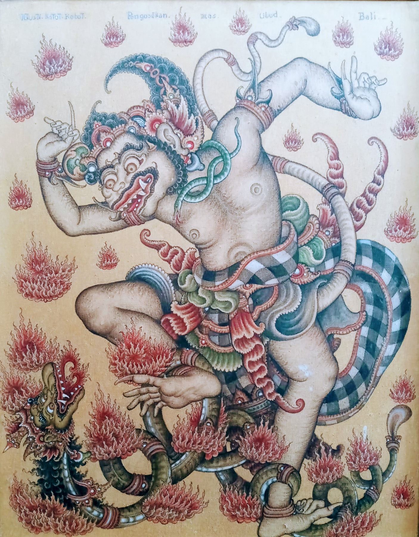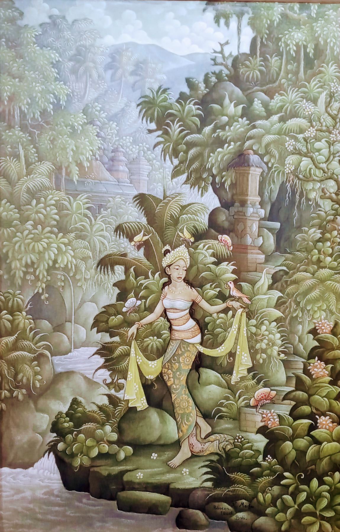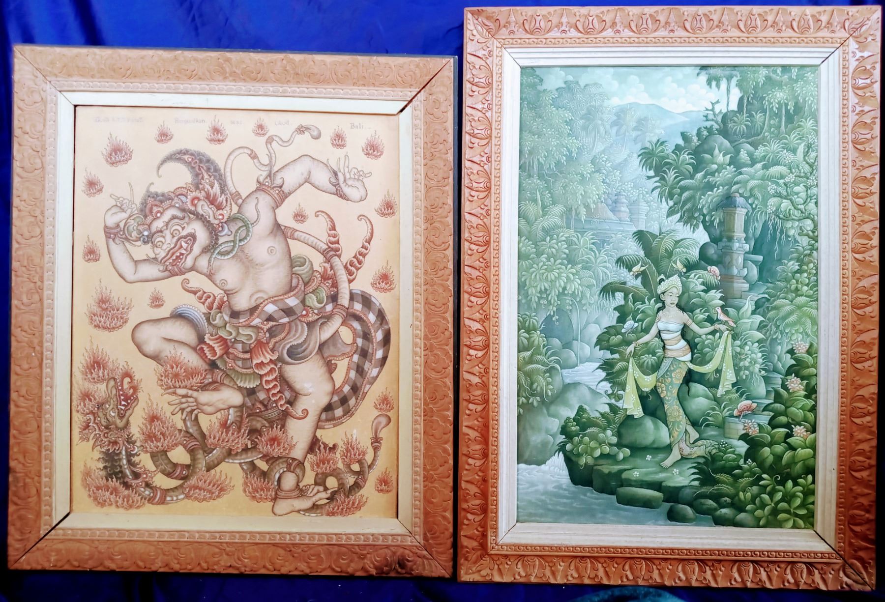 2 Acrylic Paintings of Mythical Scenes. 1 Signed by K. Madja (Peliatan Ubud, Bali) and the other unsigned. The largest is 28" H x 20" W. In good condition.