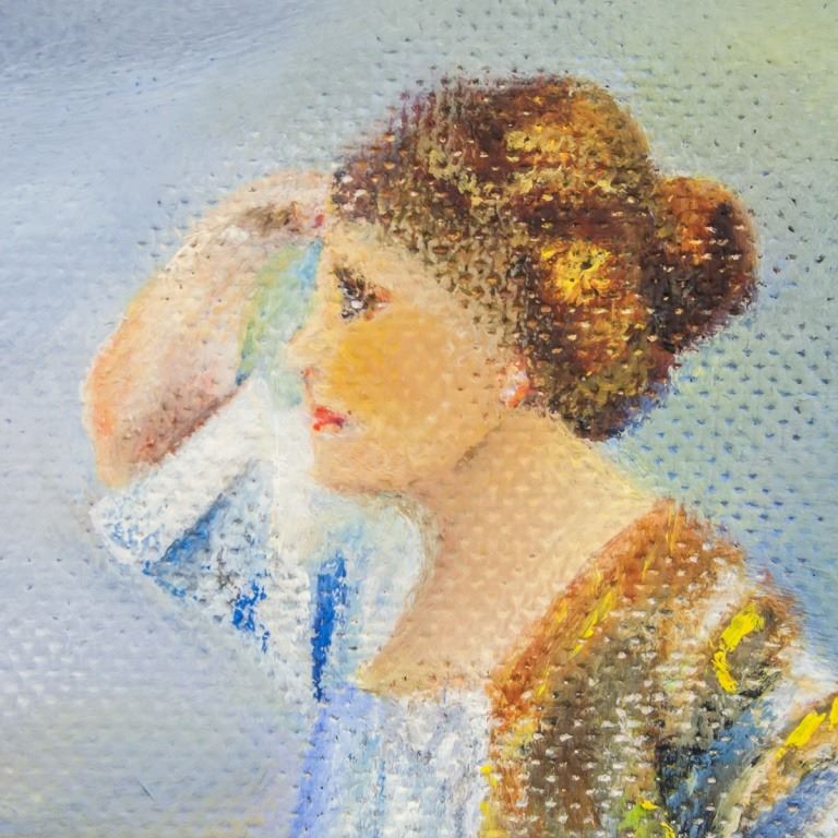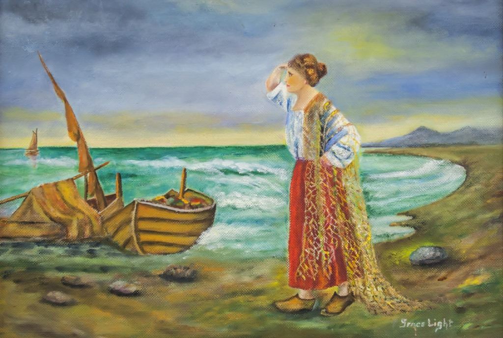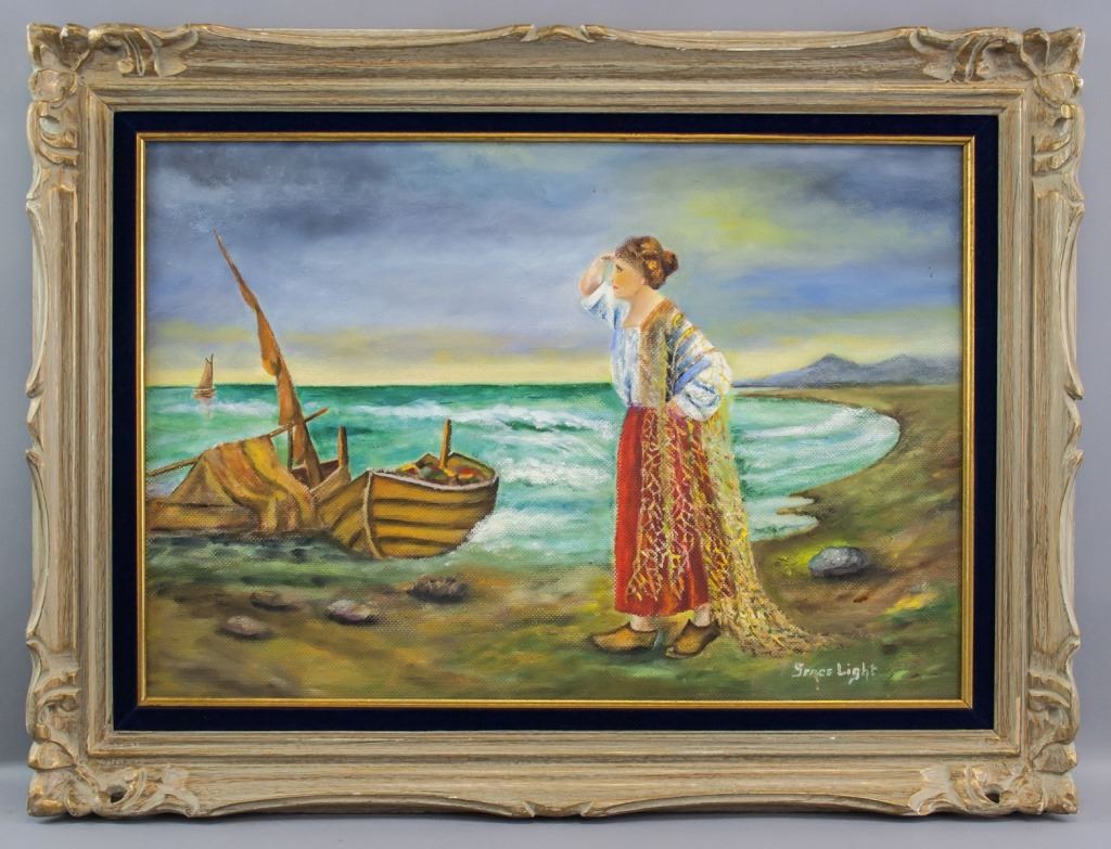 Acrylic on board, framed. Featuring a woman standing with a net over her shoulder by the shore, looking out over the ocean. Signed "Grace Light" to the bottom right. Board size: 39 x 57 cm (15.3 x 22.5 inches). Frame size: 54 x 72 cm (21.3 x 28.5 inches).